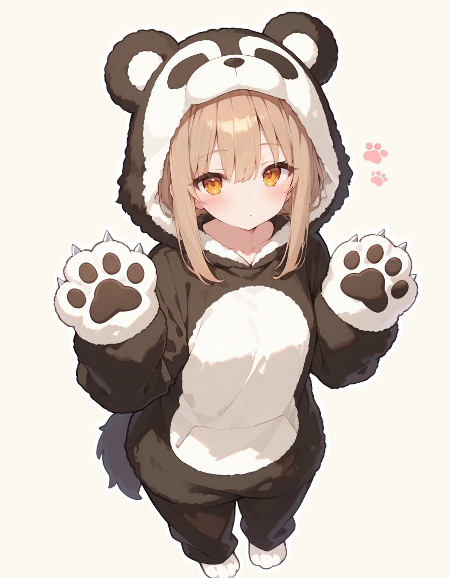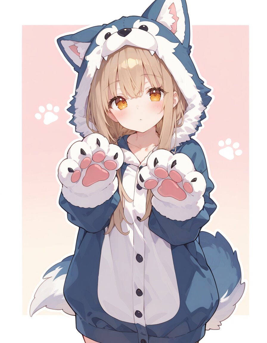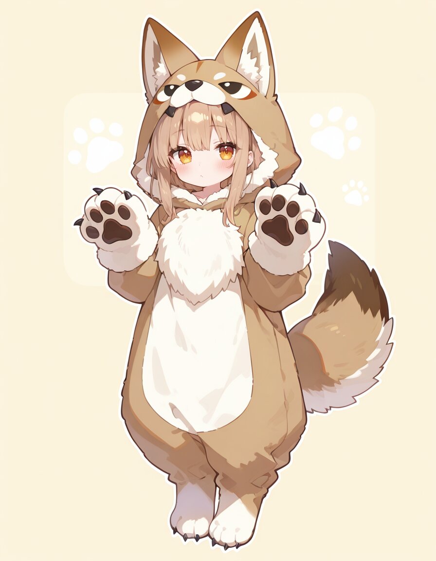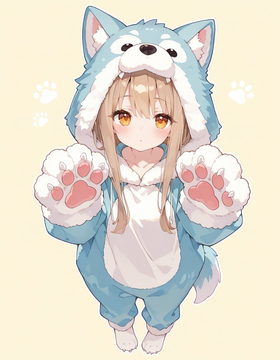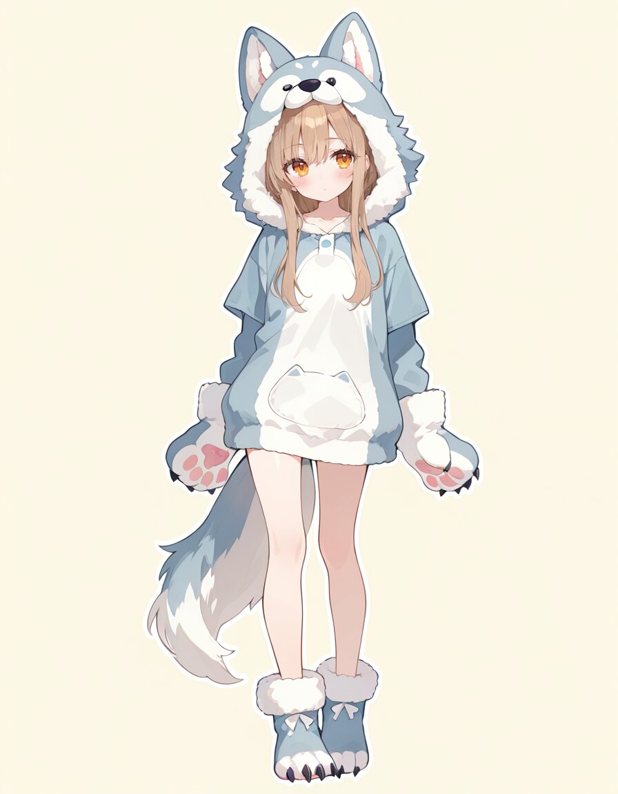 Baggy cute wolf Full-body kigurumi costume, A playful anthropomorphic wolf fursuit, fluffy fur, wolf face Hood, wolf tail, sharp claws, paw-like gloves and paw-like fur foot