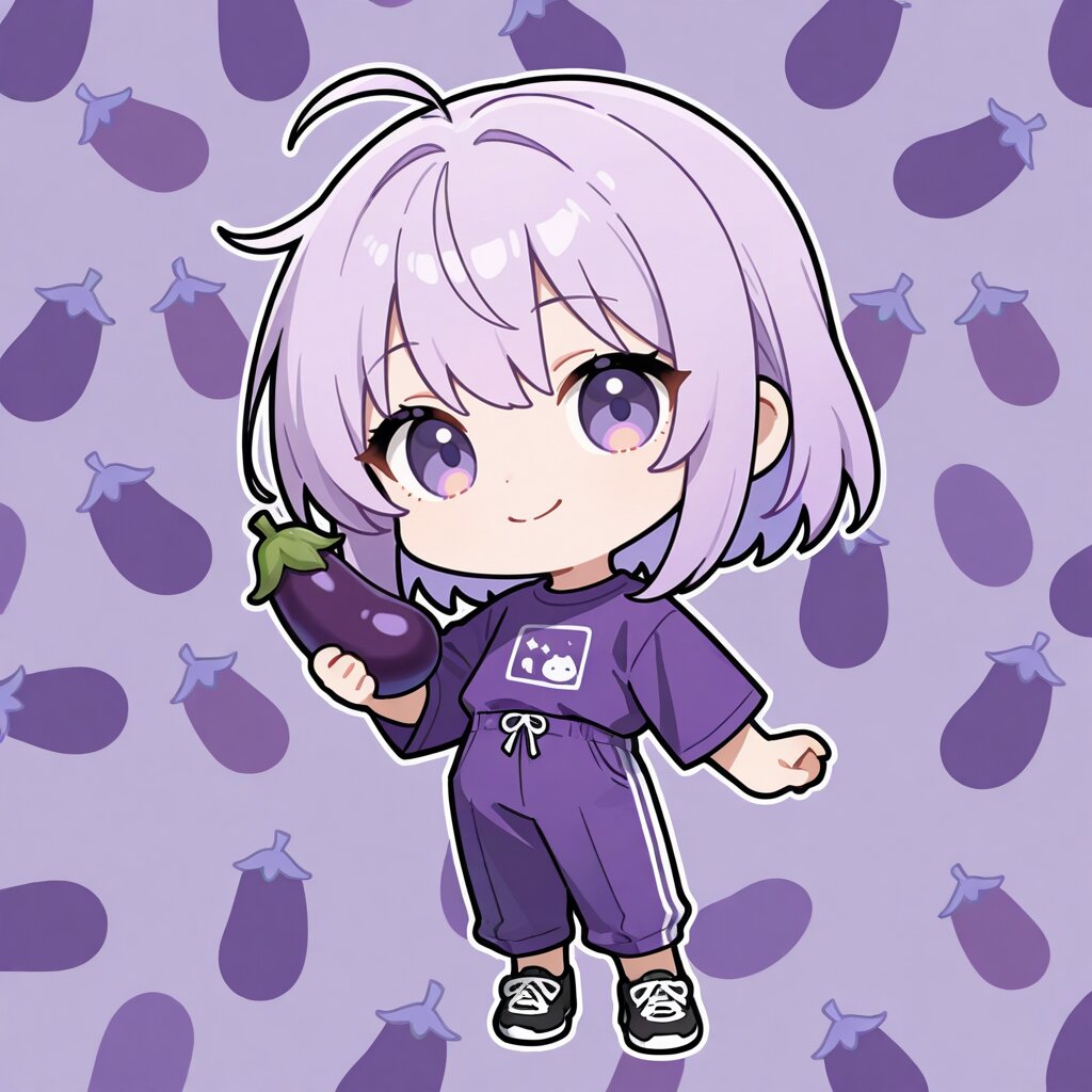 masterpiece,best quality,highres,highly detailed,general,chibi,1girl,solo,smile,purple hair,purple eyes,purple shirt,purple long pants,holding eggplant,cute eggplant background,