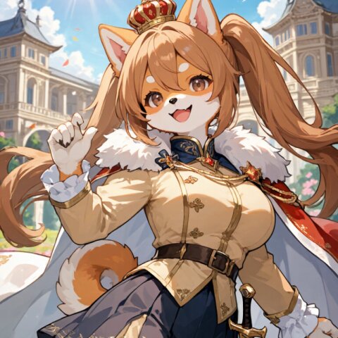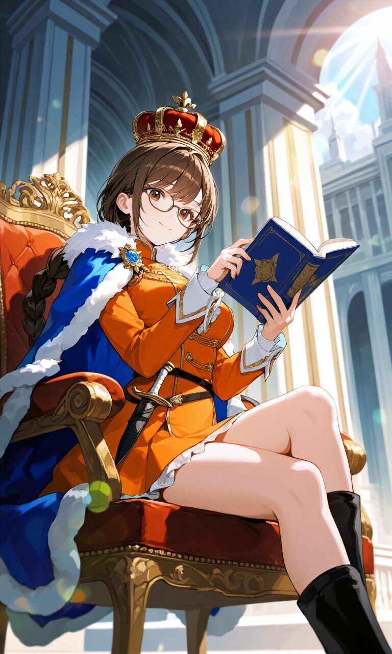 A 34-year-old woman with a confident yet cute expression sits on a (luxurious chair:1.5) in a postmodern palace, reading a book with a light smile. She has detailed brown eyes with long lashes, wearing luxurious glasses, and her brown hair is styled in a single long braid. She wears an (orange prince costume:1.4) with long sleeves, a (blue luxurious cape:1.2), and a (crown:1.2), paired with a luxurious mini skirt and stylish black boots. A (dagger on waist:1.3) completes her princely attire. The background features grand postmodern architecture with afternoon sunlight casting sunbeams, bloom, and lens flare effects, creating a romantic atmosphere. The cinematic angle from below enhances her regal presence. The illustration style is extremely detailed with outstanding intricacies, anti-aliasing, and a chill, sophisticated mood.