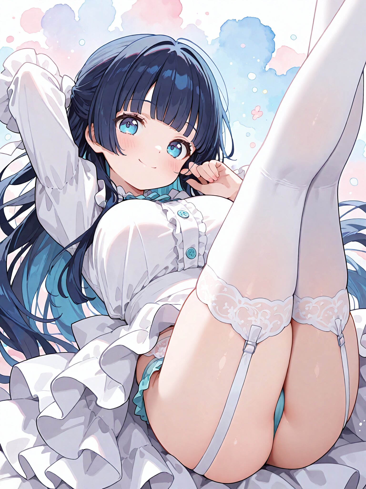 masterpiece,best quality,amazing quality,absurdres,very aesthetic,newest,(pastel colors:1.4),bright color,watercolor:1,1girl,large breasts,dark blue hair,long hair, (hime cut:1.1),blunt bangs,tareme:1.5,blue eyes,half updo,hair ribbon, BREAK abot blouse,ruffled sleeves,layered skirt ,decorative buttons ,garter belt,white thighhighs, BREAK dynamic pose,smile,closed mouth, folded, arm behind head, from below BREAK watercolor background
