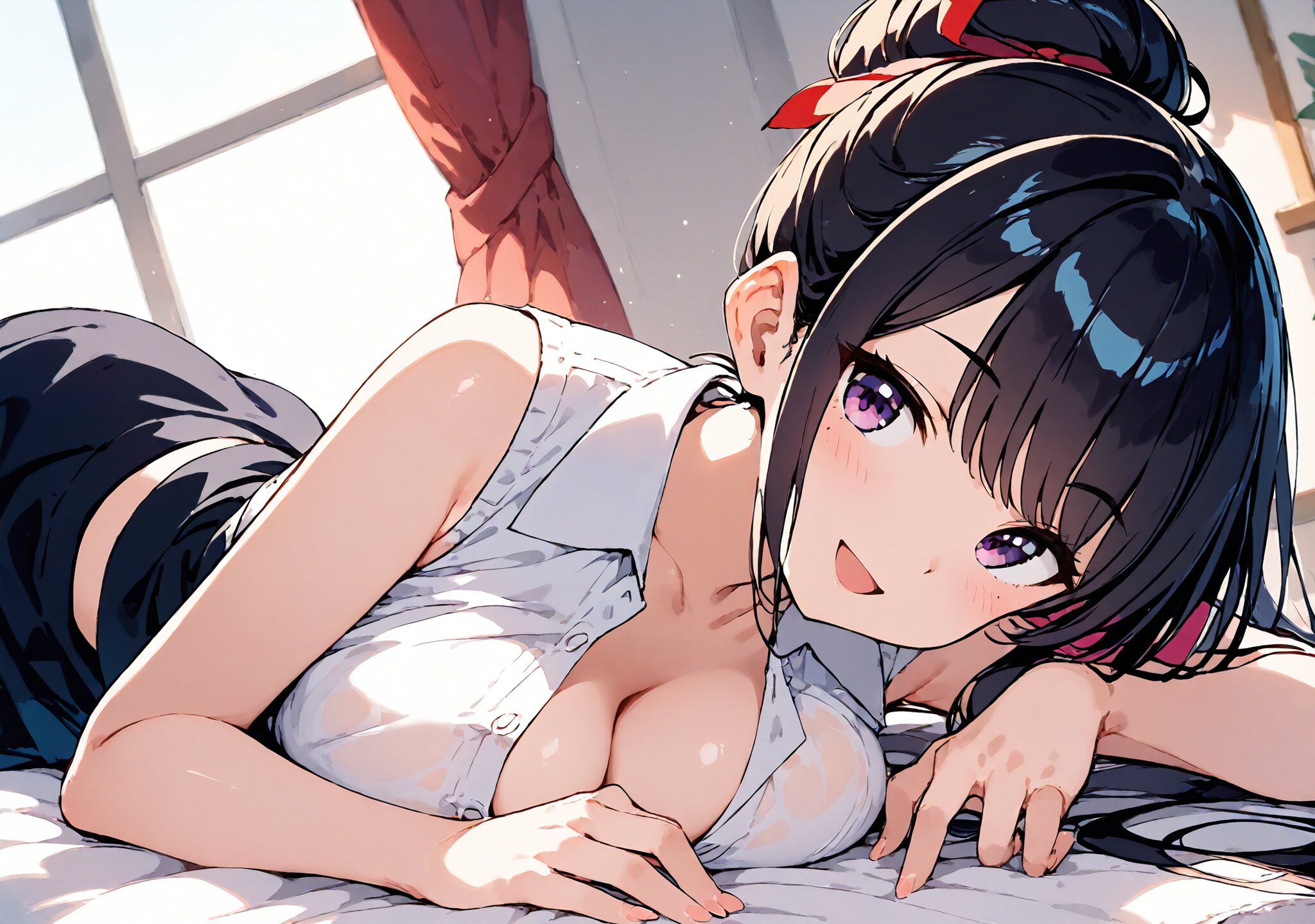 NSFW,anime,score_9, score_8_up, score_7_up, score_6_up, 1girl ,, long hair, black hair, looking at view, swept bangs, purple eyes, collarbone, <lora:Kanzaki Hiro_XL:0.8>,hair ribbon,Messy bun, big breasts,smile,lying, lie on your side, from side,open mouth BREAK short-sleeved collared openwork beige knit shirt with button-front design,sleeveless black dress underneath,Let the hem of your knit shirt out