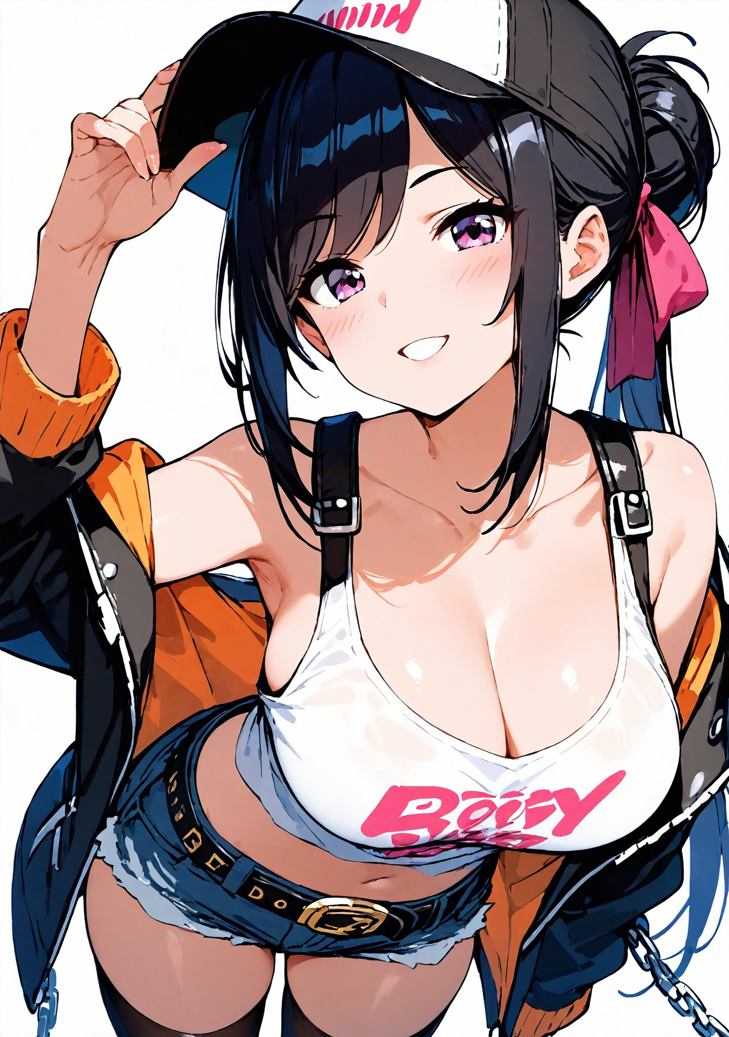 anime,score_9, score_8_up, score_7_up, score_6_up, 1girl , long hair, black hair, looking at viewer, swept bangs, purple eyes, blush, collarbone,breasts, simple background, white background, swept bangs, ,hair ribbon,Messy bun,big breasts,happy,dynamic pose, BREAK black baseball cap, black leather jacket, off shoulder, white tank top, text print, denim shorts, chain belt, micro shorts, black thighhighs,