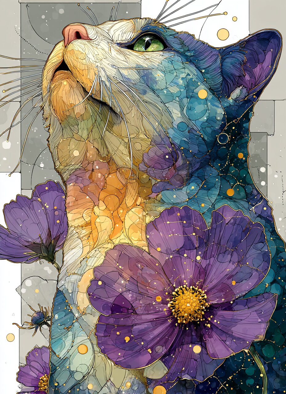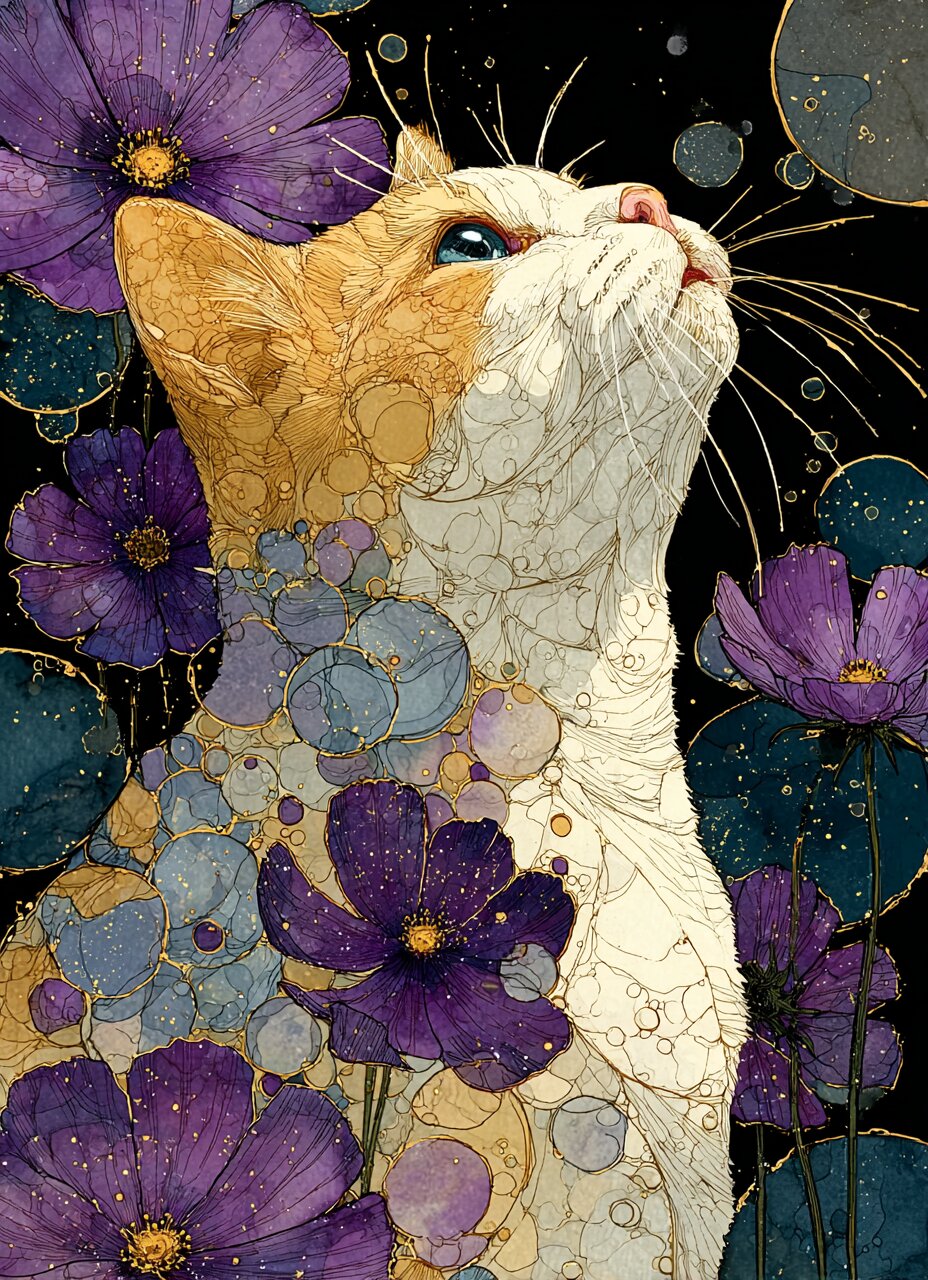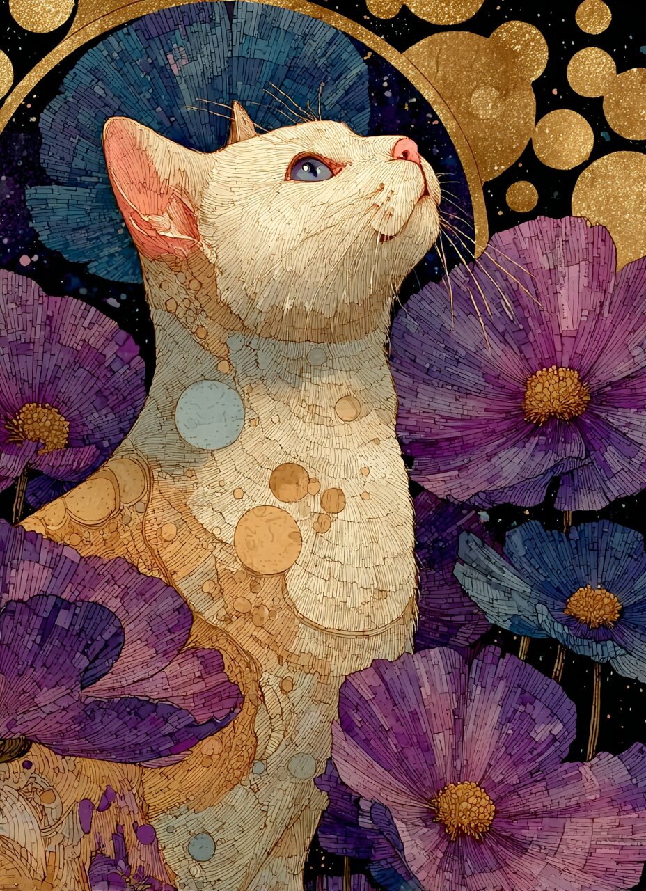 紫コスモスと猫ちゃんのイラスト、とっても素敵ですね!✨