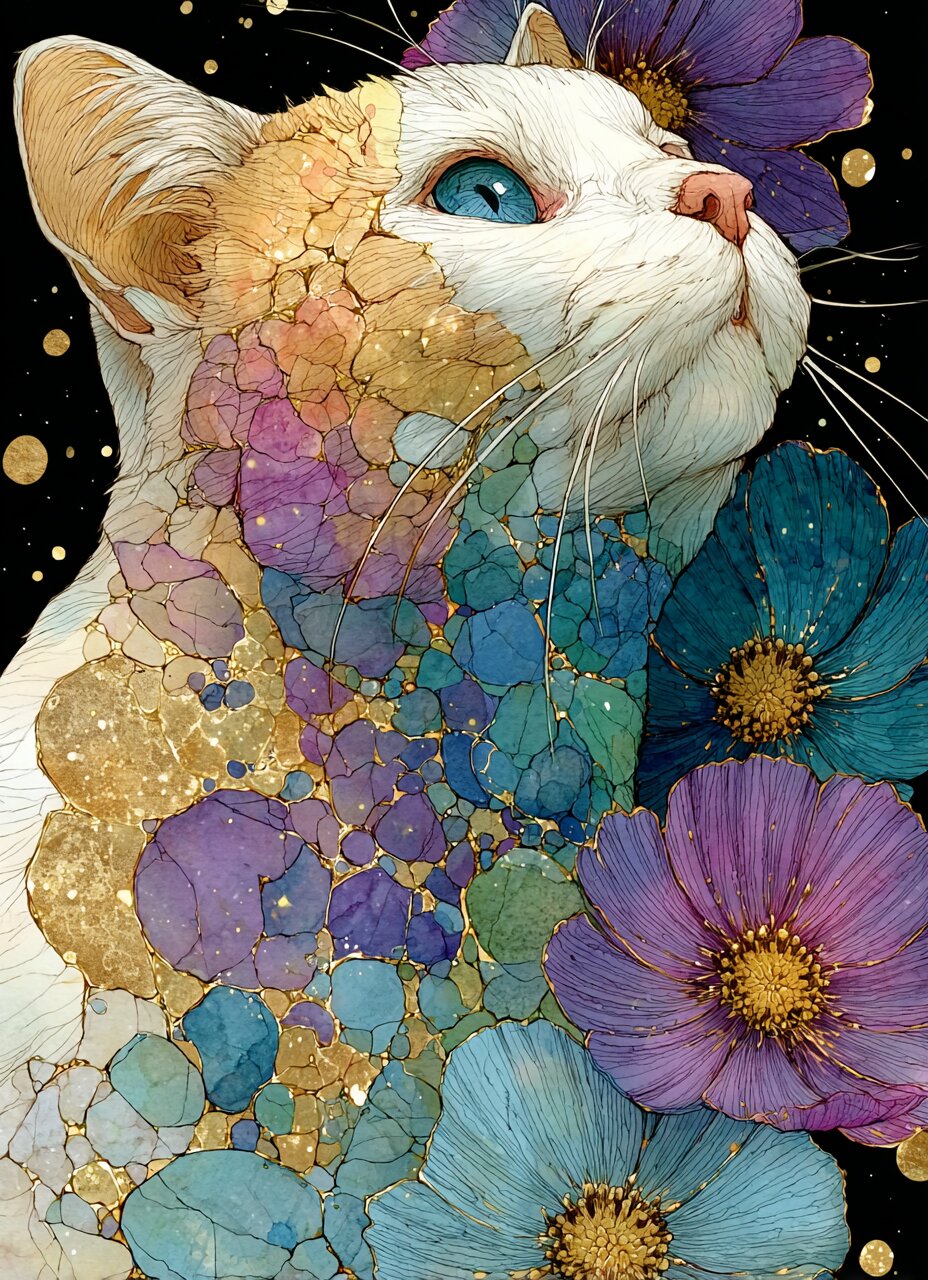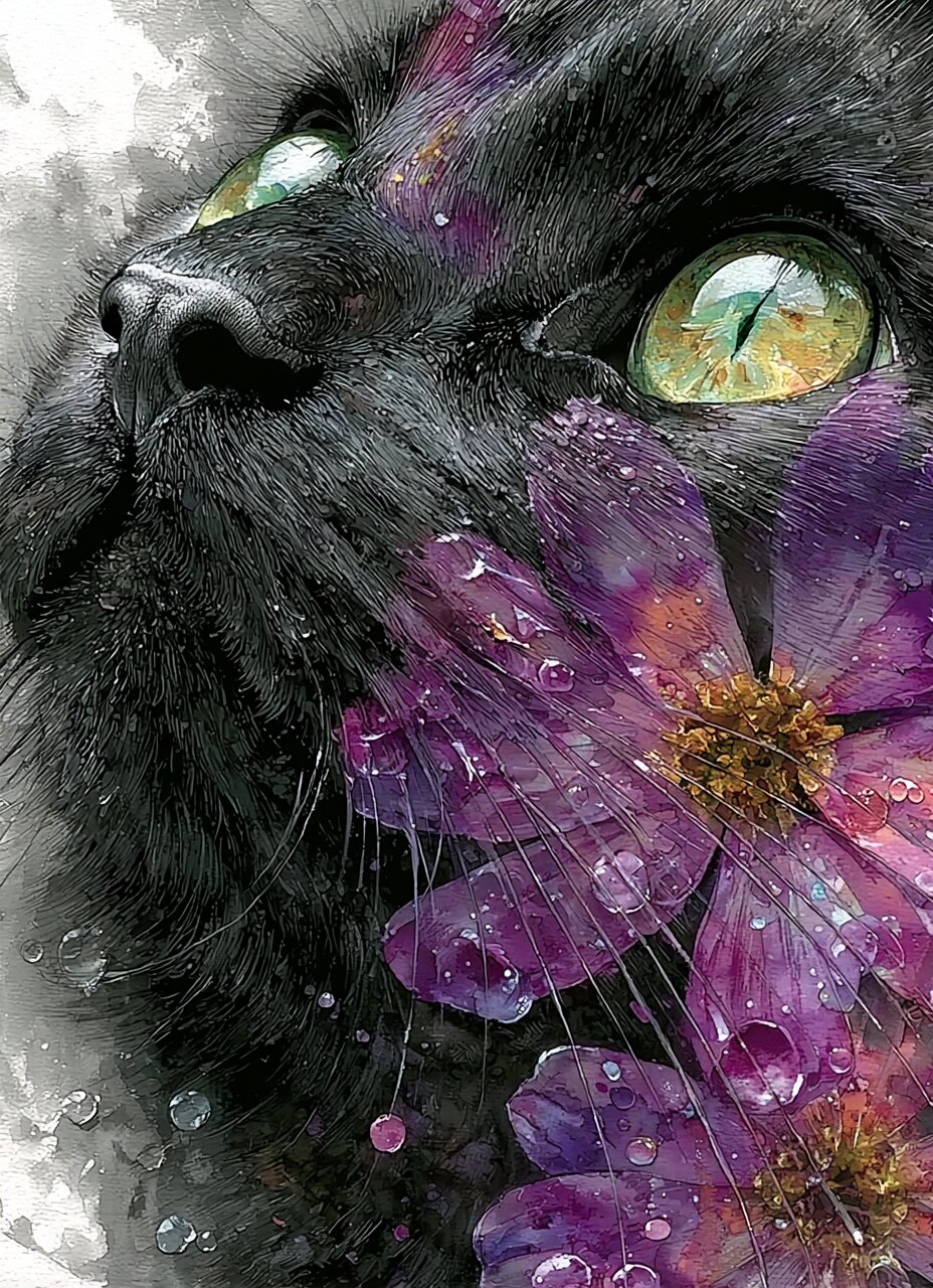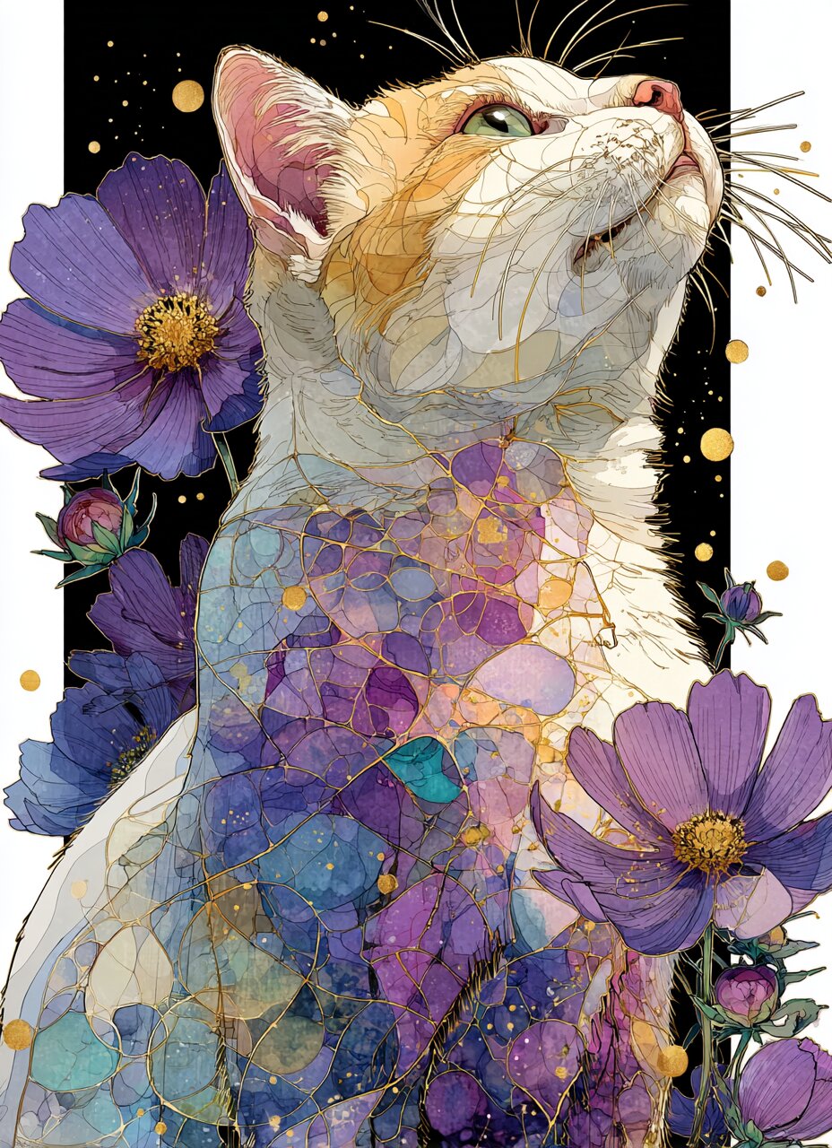 紫コスモスと猫ちゃんのイラスト、とっても素敵ですね!✨
