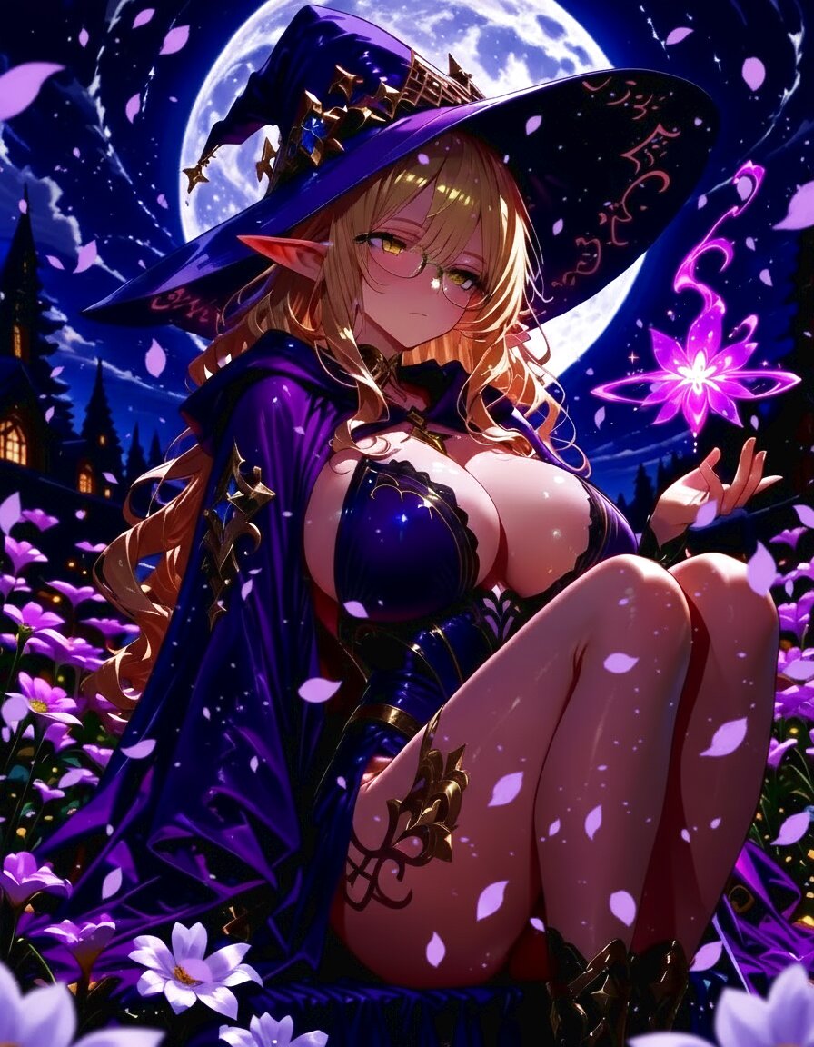 dynamic lighting,fantasic illustration,night sky,pale moon,vast flower fields,1girl,solo,(witch,elf),pointed ears,blonde wavy hair,glasses,expressionless face,purple witch hat,purple magic robe,huge breasts,sitting,knees up,((masterpiece, best quality, extremely detailed, absurdres)),
