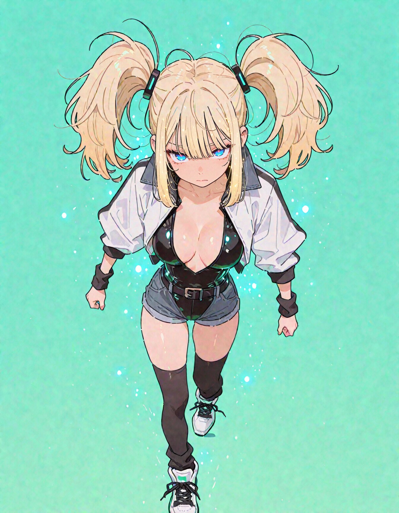 front view (wide shot:1.2) (from above,looking up:1.2) looking at viewer, 1girl, mature female,, blonde hair, medium hair, messy hair, twin tails, high twin tails, big hair, straight hair, black string hair clip, long bangs, bangs covering eyebrows, long sidelocks, blue eyes, tsurime, sanpaku, black leotard, highleg leotard, leotard bikesuit, fine fabric emphasis, center opening, collarbone, cleavage, center boob, boob, white open jacket, cropped jacket, popped collar, three-quarter sleeves, sleeves pushed up, center opening, midriff, black arm warmers. (dark grey shorts:1.1), denim shorts, black belt, (leotard under clothes:1.1), black leg warmers, black thighhighs white sneakers, chasing, (simple background:1.0), (ever green background:1.0), masterpiece, best quality, amazing quality, very aesthetic, absurdres, newest, you can add scenery, (volumetric lighting), To make the background more distinctive. professional art lots of details, , overexposure, shiny-glistening, (watercolor style:0.0), (pastel color style:1.0) 4ur4_illu,shiny, glowing, glowing particles, glowing light particles, light particles, <lora:noline (1):-0.5> <lora:sdxl2-flat2-512b:-0.2> <lora:facelightup_xl_v10:0.5> <lora:V2_yakumo_alchemy:0.5> <lora:Aura_illu:0.1>