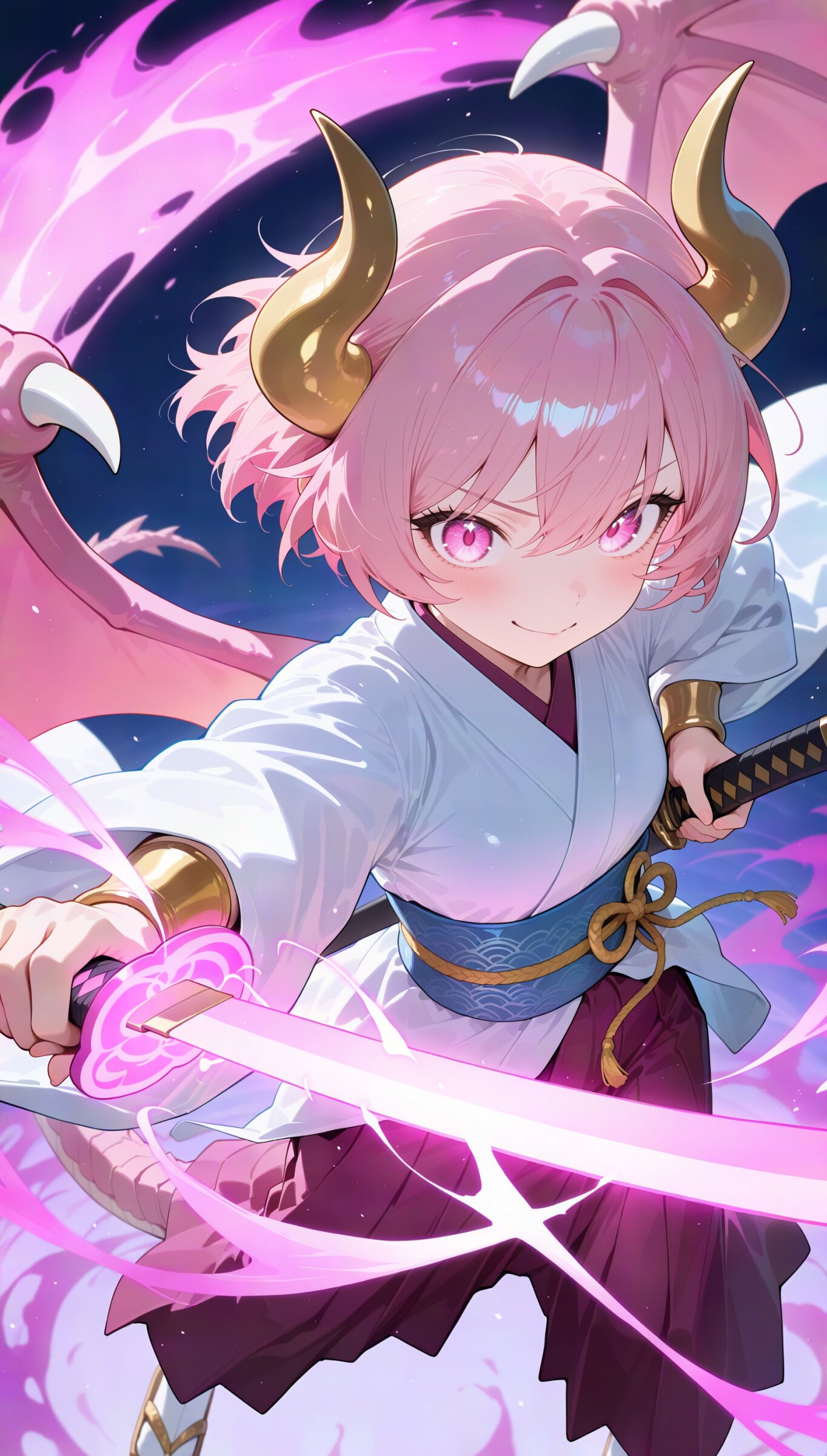 (face:1.0) (from above,looking up:1.2) looking at viewer, 1dragon girl, solo, , from front, (from above:1.2), (upper body:1.2), , dragon girl, 15yo, (2dragon gold horns attached to the head:1.2), (light pink hair:1.3), (doyagao:1.3), (wavy short hair:1.3), (beautiful pink eyes:1.3), cute, (muscle,buff well-built body,ultra-detailed muscle:0.4) , first-rate female body, perfect body, small breasts smart hips, a dragon tail (2long pink dragon wings on back:1.2), bracer, dark pink hakama,(overskirt:1.0) White Japanese Clothes , (White wide sleeve:1.0), blue and white stripe obi, inner, straw sandals, tabi, fighting smile, shiny smile, (doyagao:1.3), glowing japanese short sword, (japanese sword action:1.2), glowing sword katana katana to broadsword glint, (swirling pink energy,energy magic,energy:1.2), glowing eastern dragon pink aura, super fine concept art, hard surface, 8K, unreal engine, masterpiece, best quality, amazing quality, very aesthetic, absurdres, you can add scenery, (volumetric lighting), To make the background more distinctive. professional art lots of details, , overexposure, shiny-glistening, (watercolor style:0.0), (pastel color style:1.0) <lora:noline (1):-0.5> <lora:sdxl2-flat2-512b:0.15> <lora:facelightup_xl_v10:0.5>