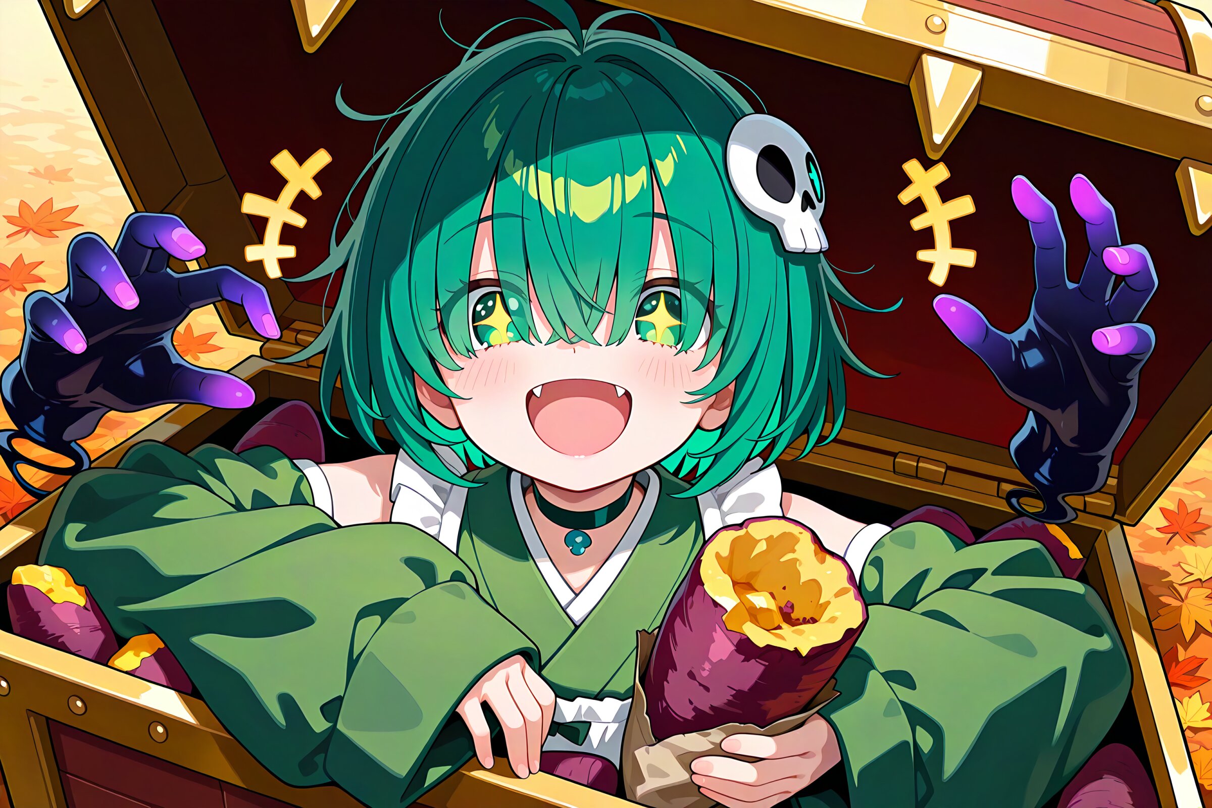 1 little girl, solo, diagonal angle, masterpiece, best quality, amazing quality, very aesthetic, cobalt green hair, short hair, messy hair, (hair over eyes:1.2), green eyes, demon fangs, +_+, open mouth, smile, cheerful, +++, notice lines, choker, green wa maid outfit, (oversized sleeves:1.2), detached sleeves, (floating black ghosty hands:1.2), skull hair ornament, in mimic chest, holding roasted sweet potato, autumn,