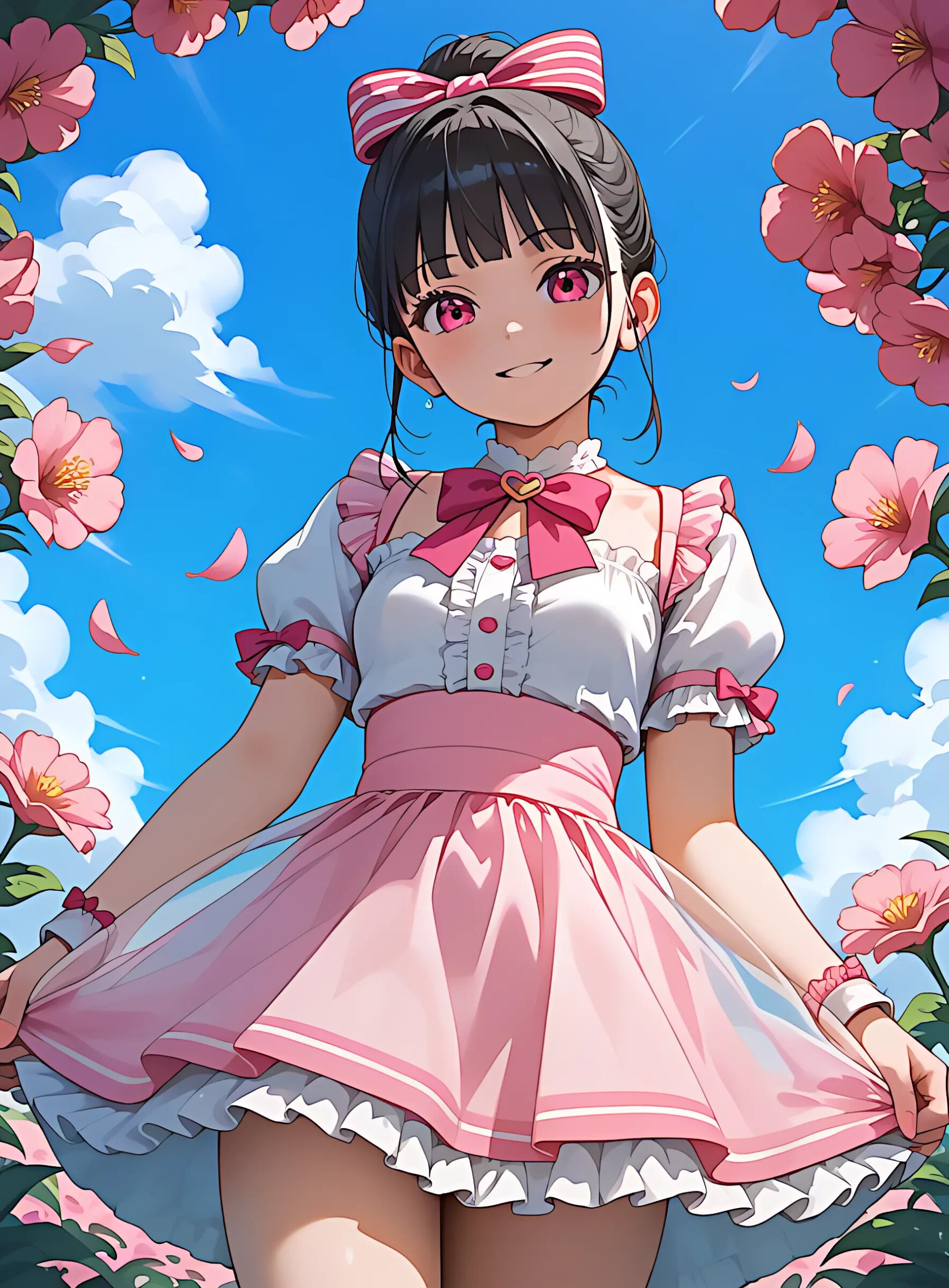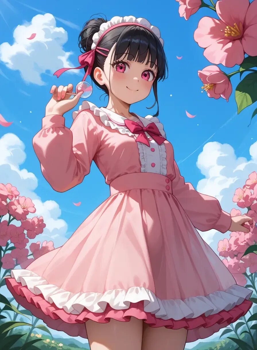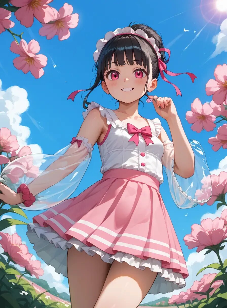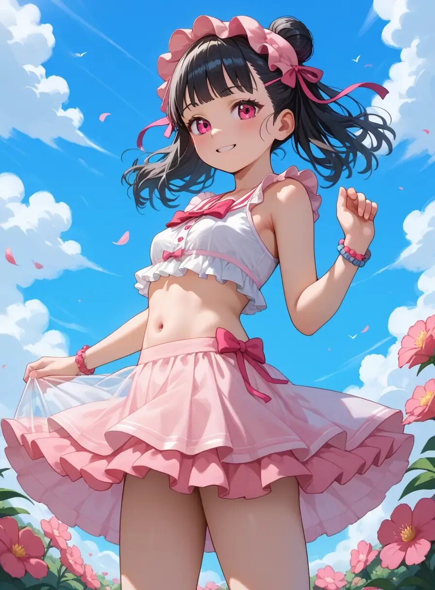 A cute elementary school girl, about 10 years old, with two-sided updo, only daughter, loli, beautiful girl, brat, minor, black hair, small breasts, and a slim figure, poses happily in a pink-themed bedroom. She is wearing the trendy fashion for Japanese girls in the summer of 2025. She wears a pink Y2K-style outfit with a frilly layered top, a tiered tulle skirt, and clear accessories such as a ribbon and a transparent bag. The main color is pink, with vibrant accents. Cute anime illustration style, high definition, and a bright atmosphere. Zettai ryoiki, summer