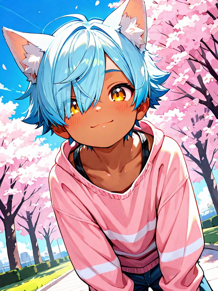 (sharp, 8k, Ultra Super Fine detailed beautiful illustration), 8k resolution, masterpiece, beautiful highlight, expression eyes, beautiful eyes, solo, dynamic angle, dynamic pose, detailed hair, detailed eyes, semi realistic, male focus, boy, shota, fox ears, golden amber eyes, bright sky blue hair, tan skin, hair over one eye, short flipped hair, spring casual men's fashion, dynamic angle, cherry blossom, cherry blossom blizzard, smile