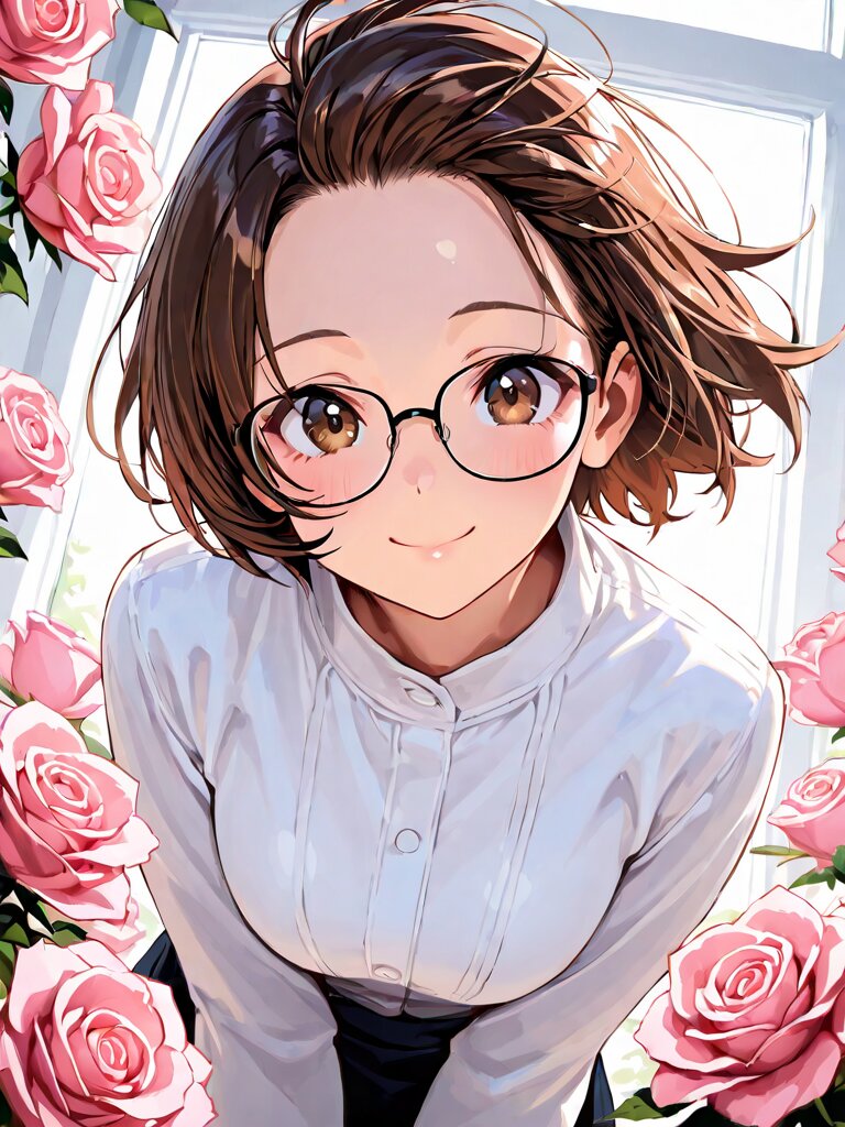 (sharp, 8k, Ultra Super Fine detailed beautiful illustration), 8k resolution, masterpiece, beautiful highlight, expression eyes, beautiful eyes, solo, dynamic angle, dynamic pose, detailed hair, detailed eyes, semi realistic, dynamic angle, woman, forehead, glasses, brown hair, brown eyes, short hair, pink roses, captivating smile