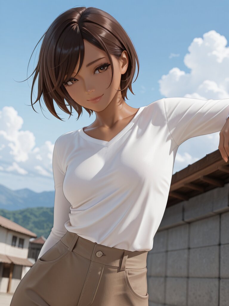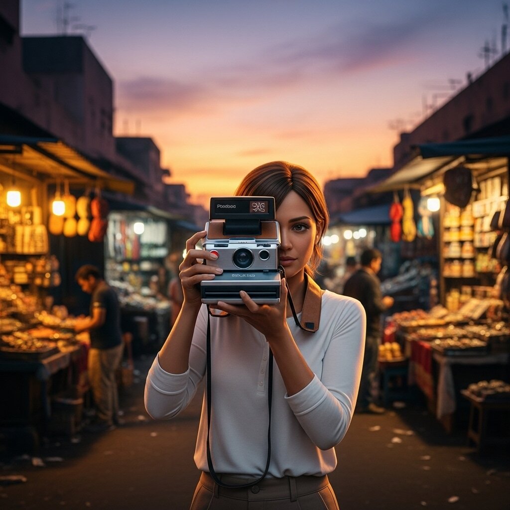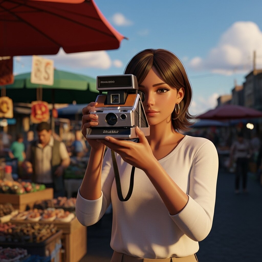 Semi-Realistic_Style, The woman specified by the model is using the camera specified by the model. She is looking through the viewfinder of the camera. The camera is facing the Viewer. It's daytime. The sky is clear. There are some clouds.