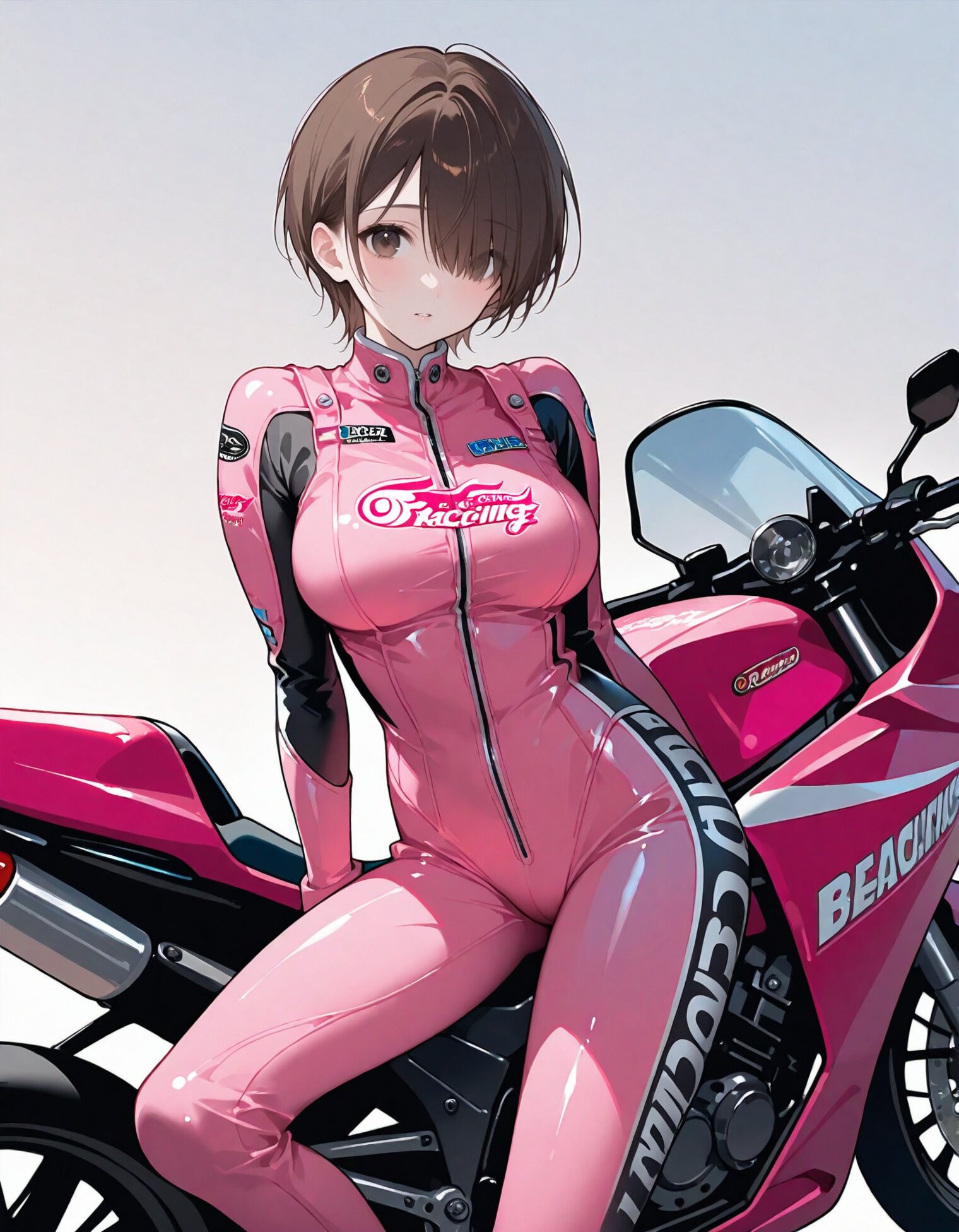 best quality,((high resolution)),(delicate illustration),((beautiful:1.3)),highly detailed beautiful face,1Girl,brown hair,emo style hair over eye,dark brown eyes,large breasts,pink racing rider suit,racing Motorcycle,from behind view,holding a helmet,