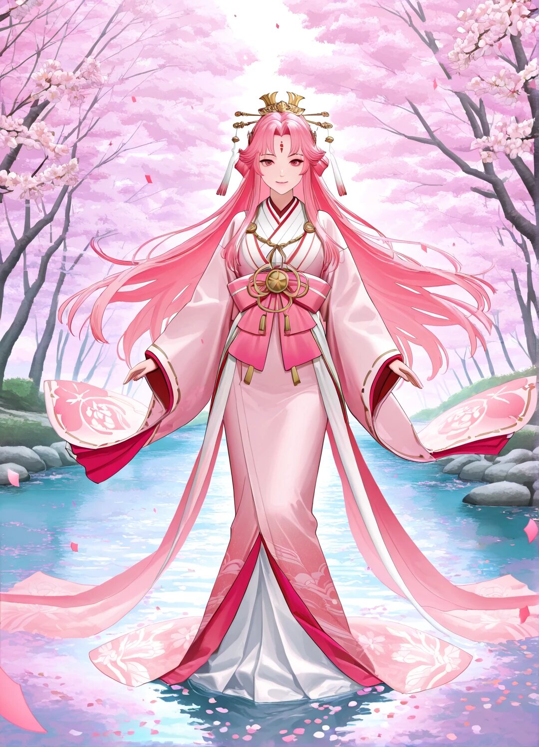 Full-body cinematic portrait of Ichikishima-hime, goddess of beauty and water, wearing a flowing pink Heian-style kimono decorated with cherry blossoms. She stands beside a serene river under blooming sakura, pastel light illuminating her gentle smile. Hyper-realistic, ultra-detailed, 8K resolution, professional photography style.
