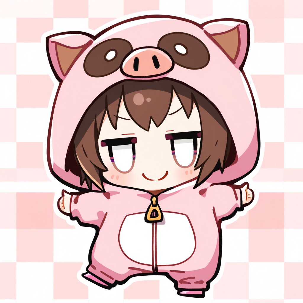 extreme chibi, 1girl, solo, brown short hair, bangs, pink tanuki hood:1.2, round tanuki ears:1.2, hands on cheek, smile, jitome, pig kigurumi, pig nose, pink and white checkered background:1.2, full body, BREAK tanuki face hood