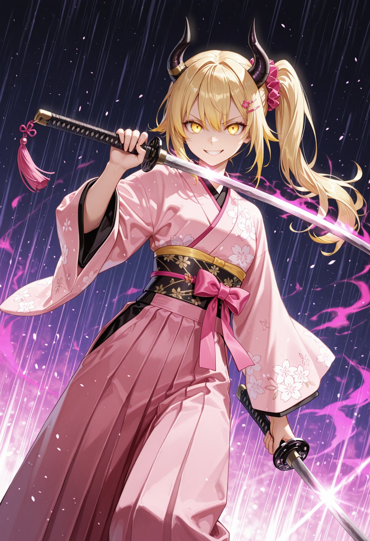 (dark aura,pink aura,dual wielding, katana,speed lines, motion lines,pink clothes),1girl,solo,17yo,two demon horns,black horns,blonde hair,long hair,glowing eyes,yellow eyes,side ponytail,hair scrunchie,pink hairclip,smile,angry smile,grin,(long sleeves, pink japanese clothes,long japanese clothes,obi,long pink hakama) BREAK night,fantasy,cowboy shot,dutch angle,dynamic pose,general BREAK masterpiece,highres,ultra detailed,best quality,beautiful detailed glow,best illuminate,ultra detailed,extremely detailed CG unity 8k wallpaper,Highly Detailed beautiful and aesthetic,high resolution,detailed,intricate details,hyper detail,sharp detail,detailed,highres,intricate details,amazing quality,very aesthetic,high resolution,ultra-detailed,absurdres,