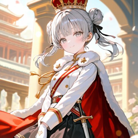 A stunningly beautiful young woman with super detailed light blue-streaked black bob-cut hair, adorned with a delicate feather hair ornament, stands in a luxurious palace ballroom. Her piercing light blue eyes, accentuated by a mole under one eye, gaze softly as she wears a (Black Prince costume:1.5) complete with (white tights:1.3), (red luxurious Cape:1.3), and (luxurious mini skirt:1.3). Her outfit is further enhanced by (black luxurious boots:1.3), a (dagger on waist:1.3), (crown:1.3), and (White gloves:1.2). She holds a (holding a bouquet in hand:1.5) of vibrant flowers while (surrounded by friends:1.8) in the opulent baroque-style ballroom filled with cascading floral arrangements. The scene radiates a dreamy, romantic academia atmosphere with soft lens flare and bloom effects illuminating the intricate embroidery of her long-sleeved outfit. Her intelligent expression carries a light smile as she celebrates at what appears to be a birthday gathering, the hyperrealistic photo quality capturing every exquisite detail of her porcelain skin and the palace's ornate architecture. The composition balances hyperdetailed realism with a magical, fairytale-like quality.