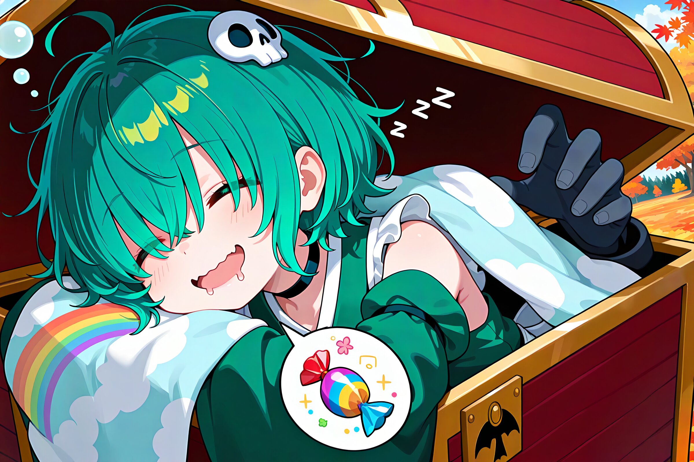 1 little girl, solo, diagonal angle, masterpiece, best quality, amazing quality, very aesthetic, cobalt green hair, short hair, messy hair, (hair over eyes:1.2), green eyes, demon fangs, closed eyes, open mouth, =_=, smile, cheerful, happy, wavy mouth, squeans, zzz, saliva, sleeping, choker, green wa maid outfit, (oversized sleeves:1.2), detached sleeves, (floating black ghosty hands:1.2), skull hair ornament, spoken zzz, spoken rainbow food, in mimic chest, colorful candy in chest, holding blanket printed sky and ranbow over her shoulders, autumn, rainbow, maple leaf, forest,