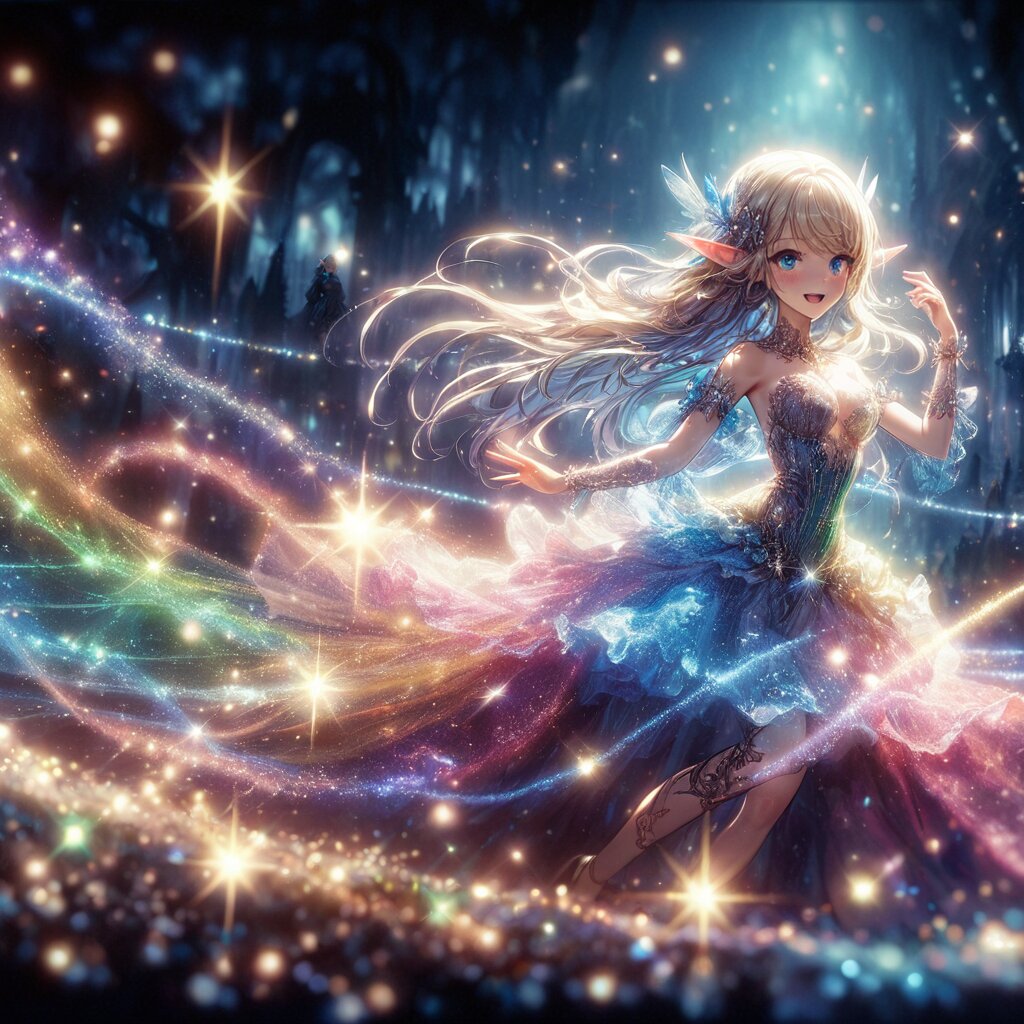 An illustration reminiscent of a movie poster. The dynamic composition and scenery are reminiscent of the final scene of a movie. A fantastical piece. A cute heroine in the style of Japanese anime. The silhouette of a glamorous elf. She is dancing in a dress made of sparkling, dazzling rainbow-colored light particles. The surrounding area is accented with light and light particles. large breast, slim waist., <lora:elf-san_alpha1(AnimagineV31):0.7> <lora:elf-san_alpha4(IL1.0):0.7>, masterpiece, amazing quality, very aesthetic, high resolution, ultra-detailed, absolute, newest, 2d, semi-realistic, moe heroine, sharp focus,