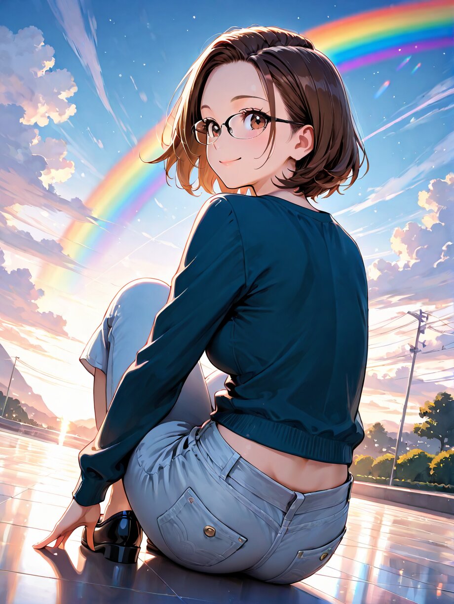 woman, casual fashion, full body, Sky after the rain, seven color Rainbow, big rainbow, clear rainbow, ride on the edge, lookup rainbow, smile, back angle, sit-down,, (sharp, 8k, Ultra Super Fine detailed beautiful illustration), 8k resolution, masterpiece, beautiful highlight, expression eyes, beautiful eyes, solo, dynamic angle, dynamic pose, detailed hair, detailed eyes, semi realistic, woman, forehead, glasses, brown hair, brown eyes, short hair,
