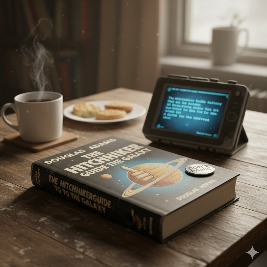 さて、プロンプトコーナーです。今回はGoogle AI StudioとFluxにSeedream4.0です。それっぽい物を出してくれました。しかも、1枚目の画像には小説の後ろ側に電子端末が置かれています。これ、もしかして「銀河ヒッチハイクガイド」を出してくれたのですかね?だとしたら凄いな!もう十分過ぎですw。