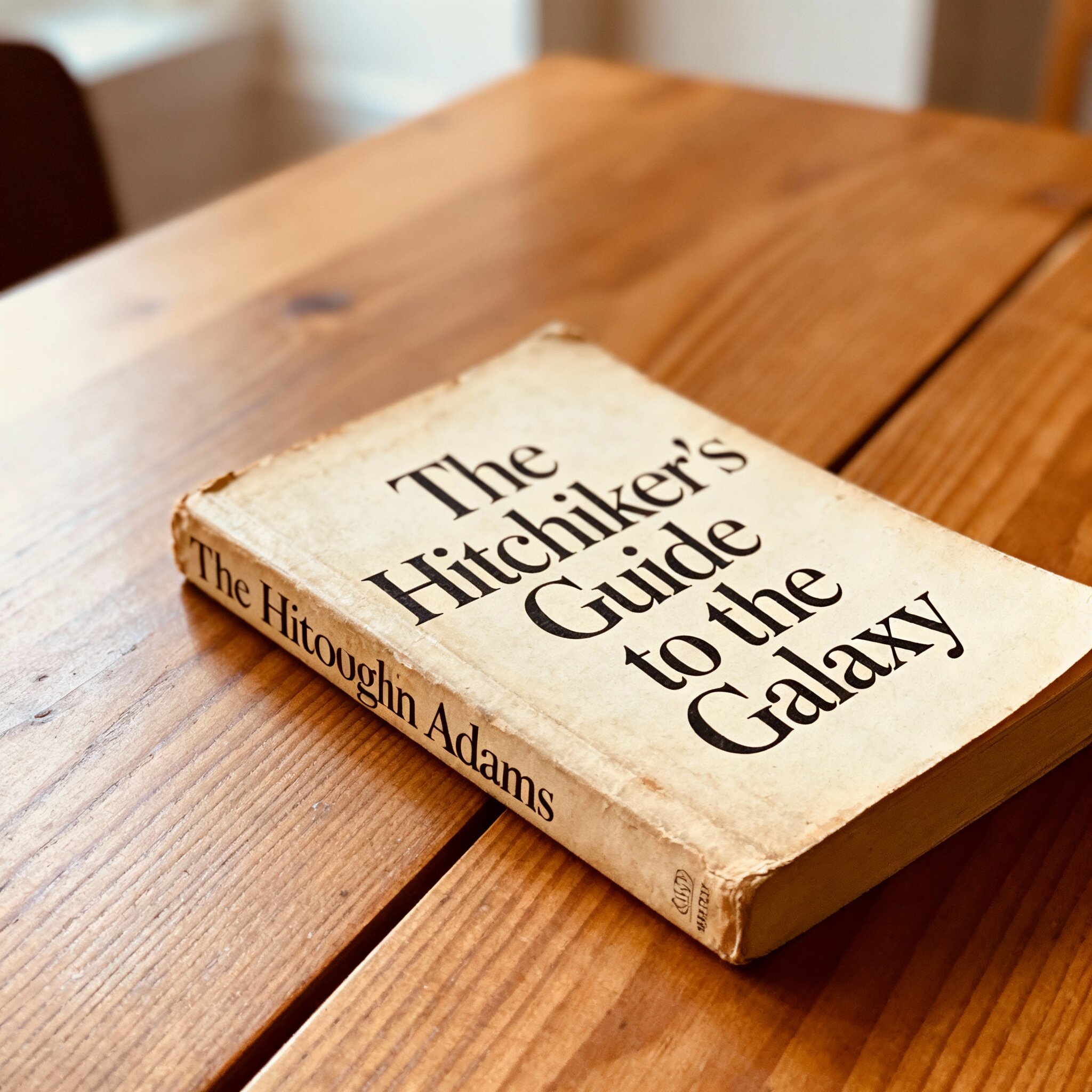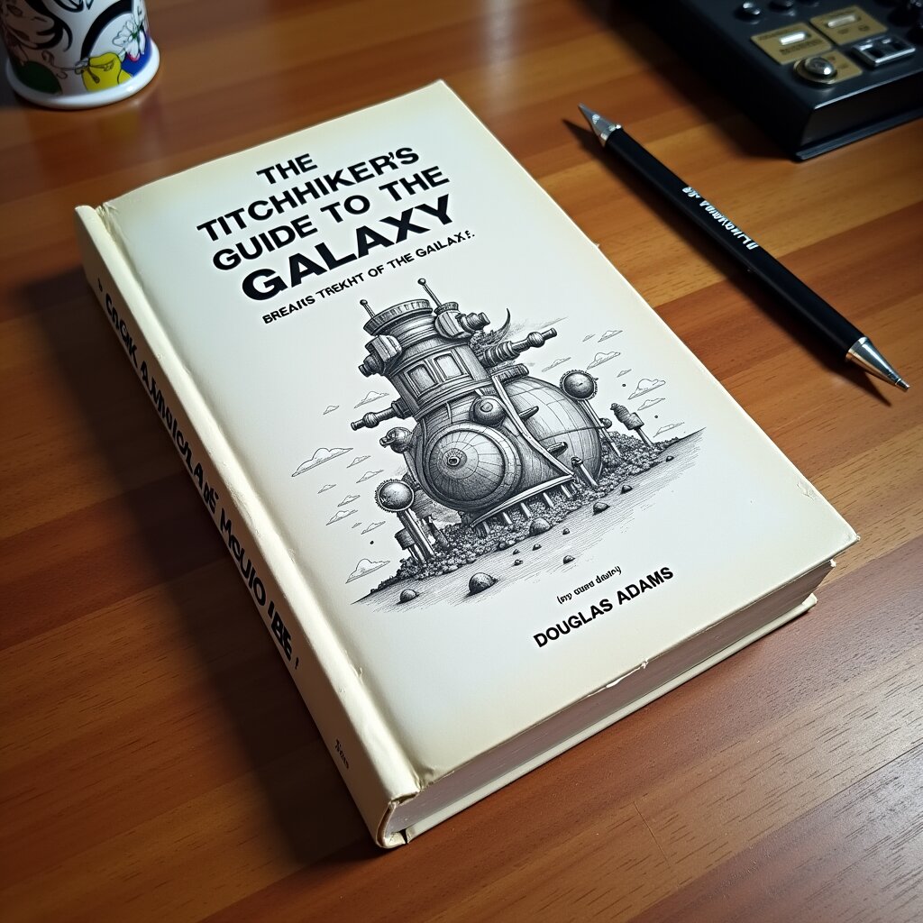 Please draw it in photo quality. Douglas Adams' novel The Hitchhiker's Guide to the Galaxy is placed on a wooden table.