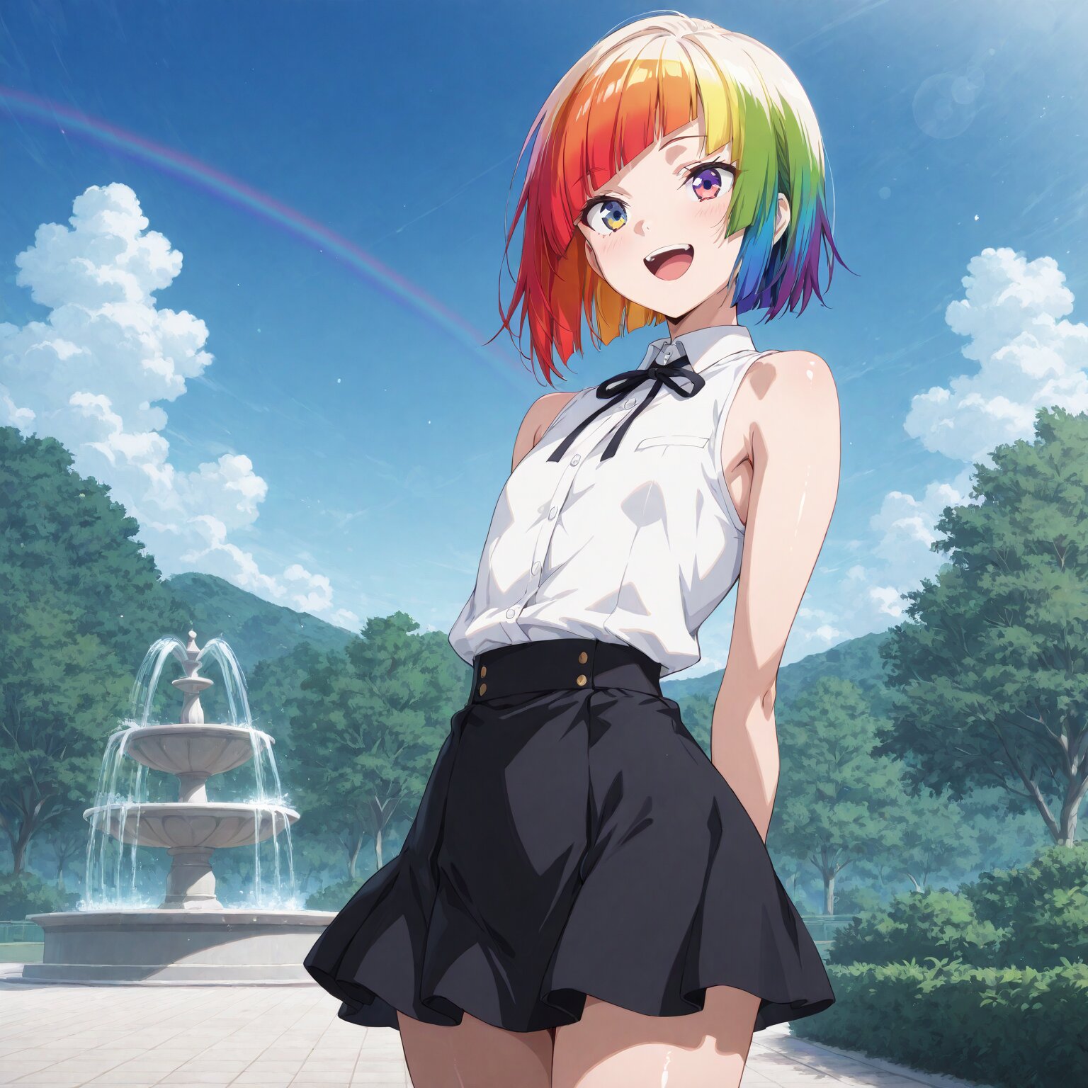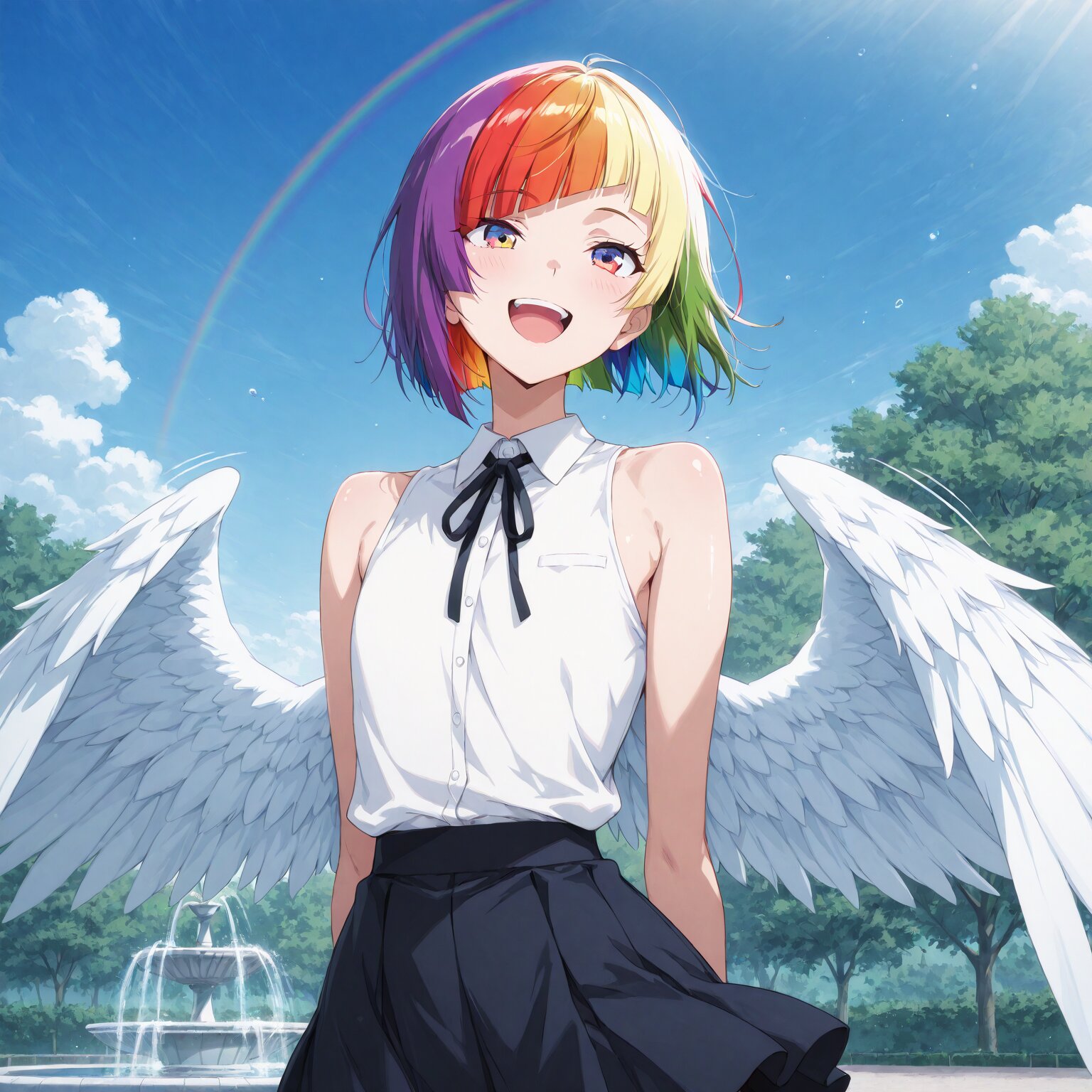 (1girl), BREAK, ((Rainbow colored hair, rainbow colored eyes, Seven colored hair, rainbow gradation:1.3)), BREAK, (shiny hair, short cut, diagonal bangs, straight hair, eyes without light, no emotions, thin body, flat chest:1.3), BREAK, Slender, narrow waist, toned body, athletic body, shiny skin, beautiful pupils, Sleeveless shirt, white shirt, black ribbon Miniskirt, laughing Park, fountain, sunny day, blue sky, ((rainbow)) Angel wings, large wings, flapping BREAK, ((newest, anime, animation, anime screen capture, anime style:1.3)) BREAK, ((masterpiece, , vibrant, very aesthetic, highly detailed, best quality, 16k:1.3)) ultra HD,8k,24k,professional composition, amazing quality, best quality, ultra-detailed, very aesthetic, aesthetic, highres, absurdres, HDR, high resolution,great score, masterwork, intricate details