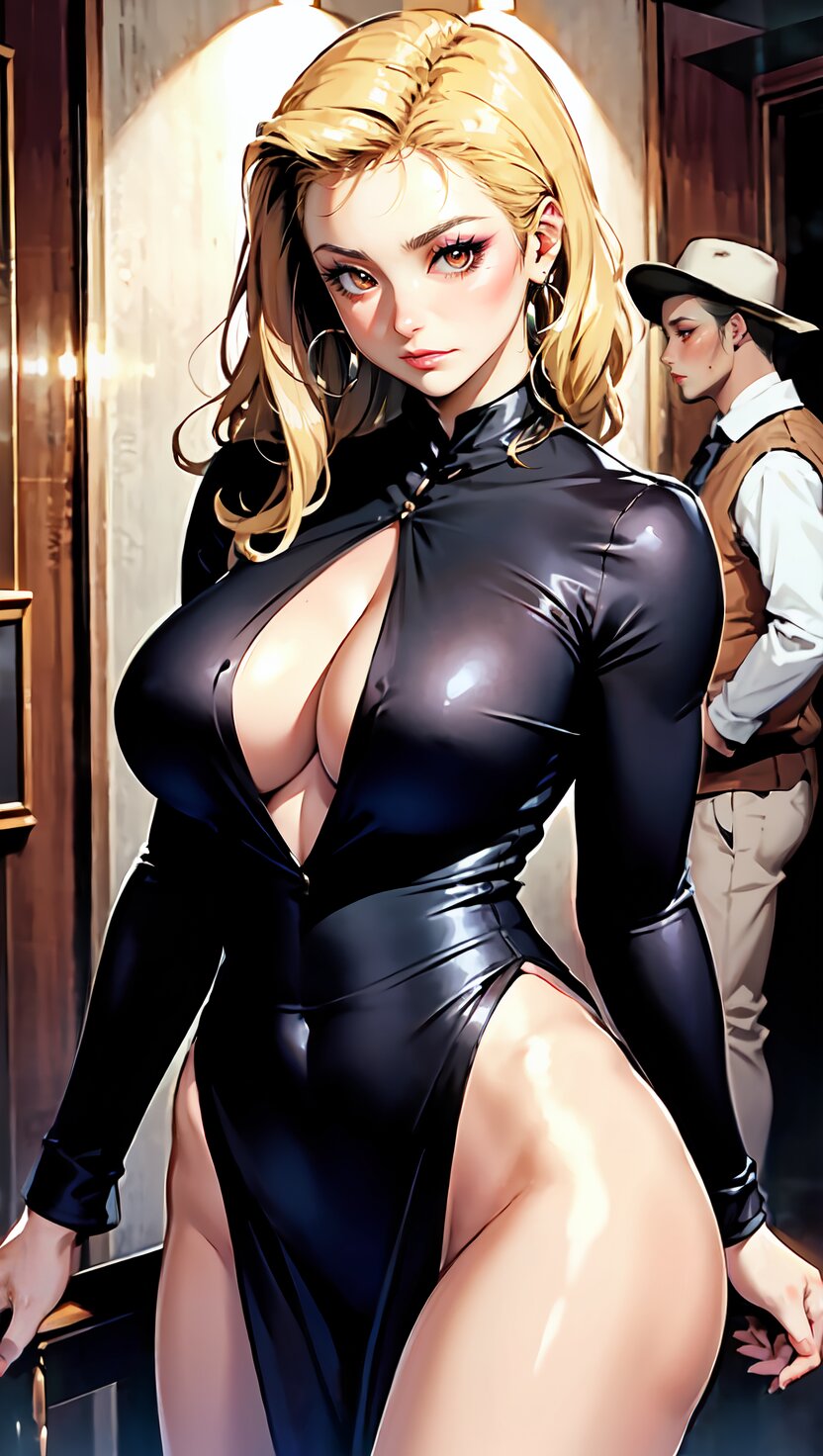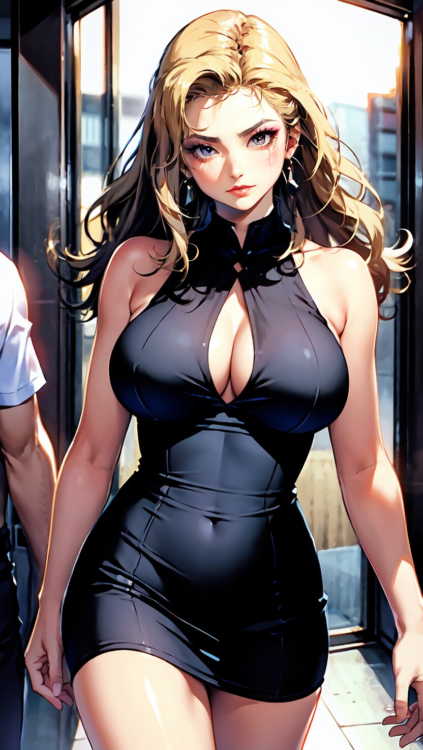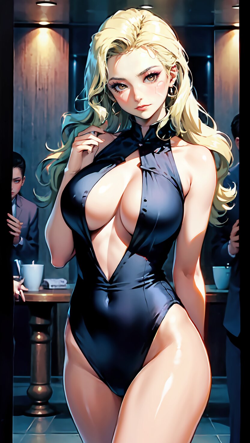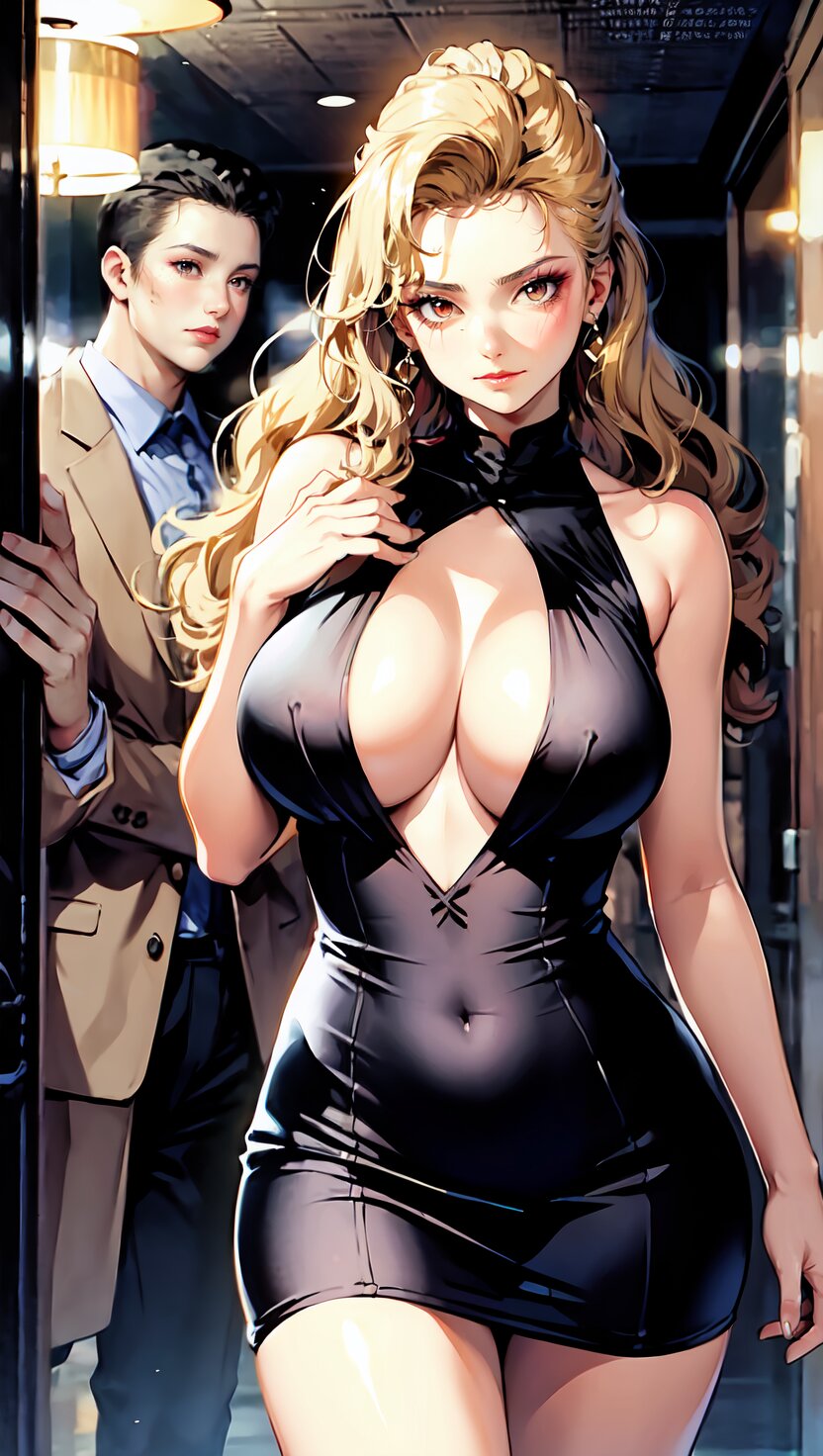 from front, (8k, best quality, masterpiece:1.4), (realistic, photo-realistic:1.6), HDR, (incredibly absurdres:1.2), (vibrant color:1.2), ultra-detailed, (sexy pose: 1.4), (1girl and 3boys, molestation: 1.4), 18 years old, nice detailed eyes, perfect anatomy, (busty, large breasts: 1.8), blond hair, looking away, (walking and posing: 1.4), (cowboy shot, chemise dress: 1.4), princess, perfect skin, detailed skin texture, at the party in luxury hotel room, <lora:KyokaS_v01:0.8>