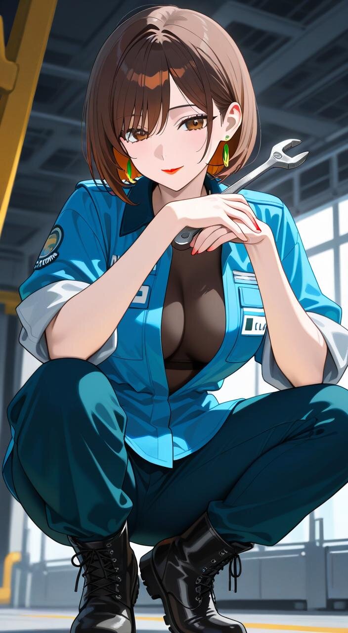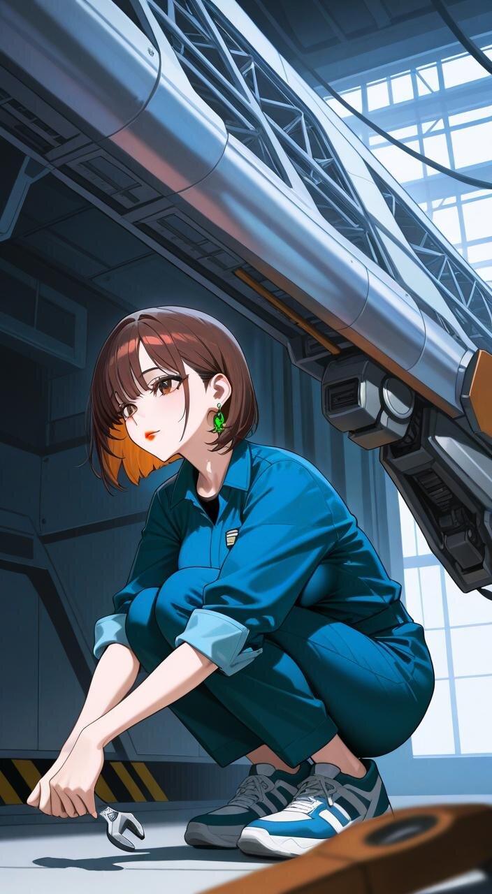 ショートボブの茶髪に琥珀色の瞳。作業用のブルージャンプスーツを着用し、腰にはツールポーチを常備。油汚れも気にせず機体の下にもぐり込む姿が印象的。