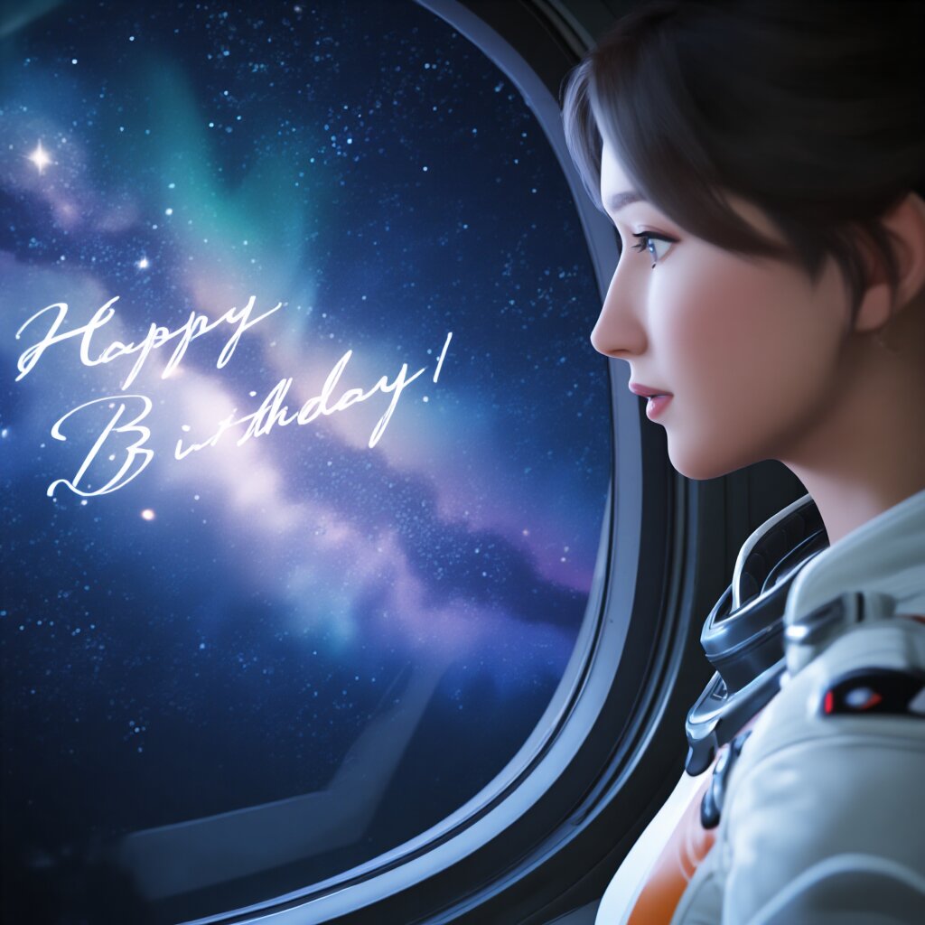 Stella is the heroine in Whispers from the Star,realistic anime style, 3D shading,A girl gazing out from a spaceship window, surrounded by soft cosmic light. Outside the window, a glowing nebula shaped like "Happy Birthday" floats among the stars. Ethereal atmosphere, gentle lighting, dreamy sci-fi style. She wears a sleek futuristic suit with subtle holographic accents. Background filled with deep space, shimmering particles, and aurora-like star clouds. Emotional, quiet, and magical mood.