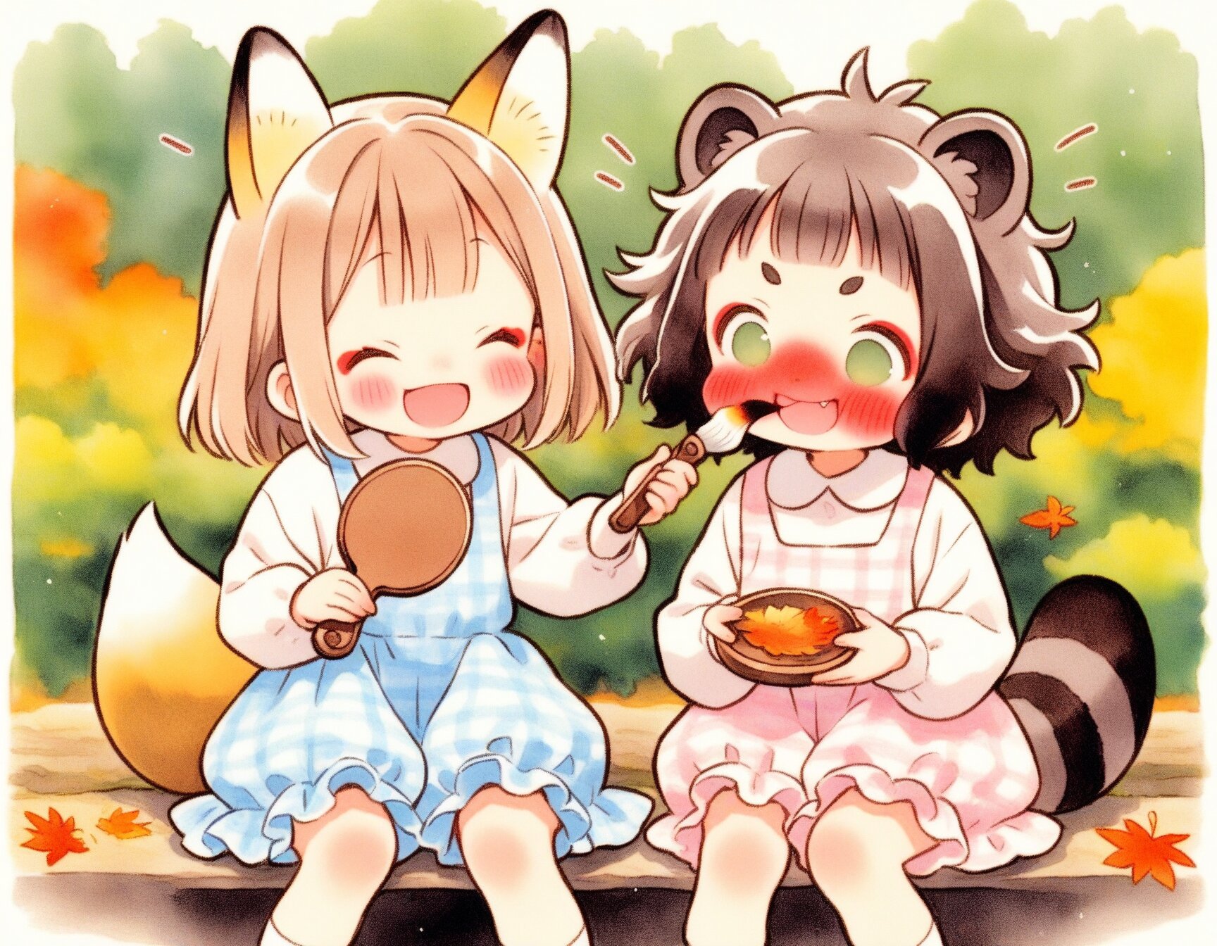 2girls, loli, mid, general, traditional media, picturebook-style, (colored pencil drawing), pastel colors, soft tone, (blurred boundaries, drawing lines, Paper texture), cute, deformed, ultra-detailed background, (barasui:0.1), (oyari ashito:0.1), (masterpiece, best quality), cowboy shot, expressive, rich expression, autumn, outdoors, mountains, forest, sitting, makeup play, pretend play, blush makeup, overapplied blush, (red cheeks:1.2), smiling, laughing, cute, heartwarming, wholesome, pastel_colors, soft shading, (holding brush:1.4), (holding mirror), (Heavy makeup), BREAK loli, light brown hair, medium hair, choppy bangs, blue eyes, (light brown fox ears, Light brown fox tail with white tip, petite), pink pinafore dress, frilled bloomers, (red cheeks:1.2), BREAK loli, dark brown hair, short hair, messy hair, short bangs, green eyes, Droopy eyes, (dark brown raccoon ears, dark brown raccoon tail with striped pattern), green pinafore dress, frilled bloomers, (red cheeks:1.2),