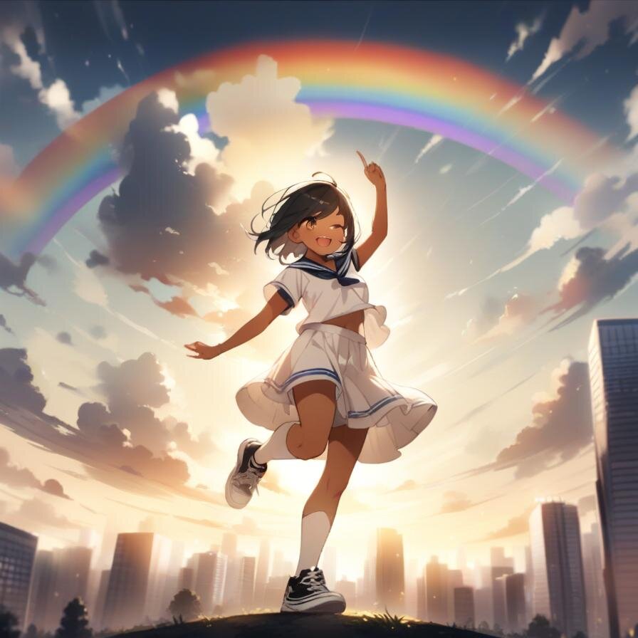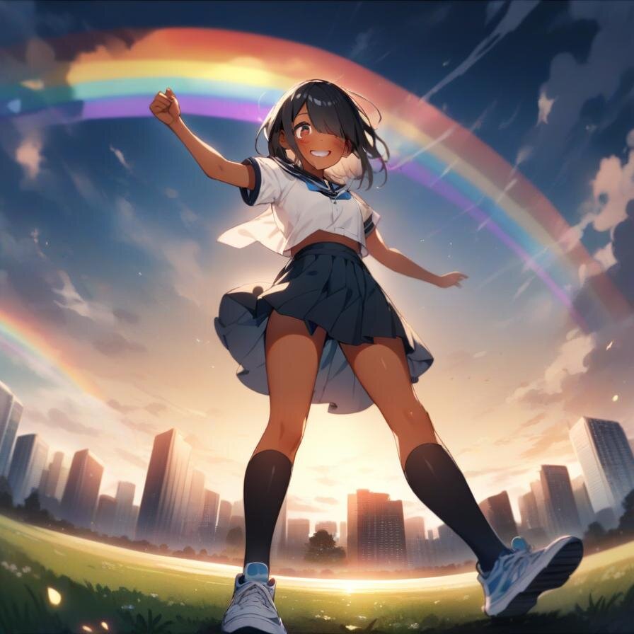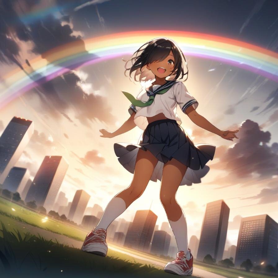 Landscape, panorama, from below, cinematic angle, park, cityscape, skyscraper, (((rainbow))), dusk, happy smile, slight blush, dancing girl, uniform, summer clothes, knee-high socks, sneakers,hair over one eye、aroused、early teen、dark skin、solo、black hair、short hair、tareme、1girl、blurry background、