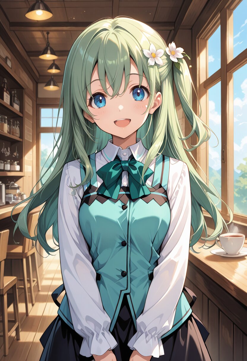 masterpiece,best quality,amazing quality,general, fine detail, official art, 1girl, cute face, hair ornament, long hair, one side up, green hair, 1 girl, solo, hair flower, blue eyes, smile, open mouth, :d, collared shirt, shirt, white shirt, green vest, green bow, bow, vest, long sleeves, green bowtie, bowtie, wing collar, buttons, black skirt, long skirt, rabbit house uniform, standing, looking at viewer, cowboy shot, sky, day, indoors, cafe, (intricate:1.1), masterpiece, best quality, highest quality, highly detailed face, ray tracing, vibrant colors, depth of field, cinematic lighting, sharp focus, action shot, (Extremely Detailed 16K CG)