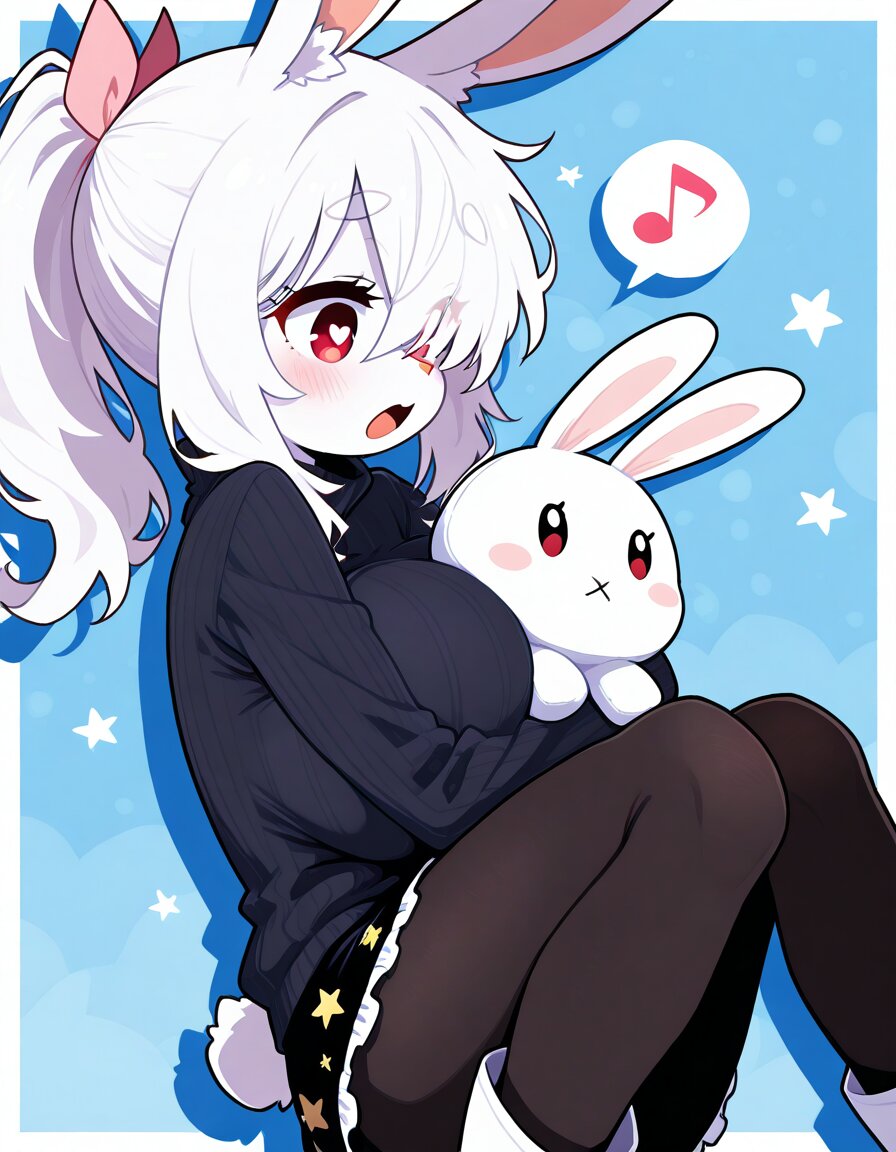 1girl, solo, short female, child, oppai loli, rabbit girl, petite, furry female, white fur, fluffy body fur, stand fur, white rabbit ears, rabbit nose, white rabbit tail, huge breasts, slim, white hair, long hair, ponytail, pink ribbons, hair between eyes, hair over one eye, red eyes, round eyes, heart-shaped pupils, heart in eyes, raised inner eyebrows, open mouth, singing, layering, long sleeves, black sweater, ribbed sweater, turtleneck, frill trimmed skirt, black skirt, wide A-lines, black pantyhose under clothes, white knee boots, boots over pantyhose, rabbit stuffed animal, hugging rabbit stuffed toy, knees up, knees together feet apart, spoken musical note, white border, looking ahead, looking down, from side, drop shadow, saturated, smooth, dramatic angle, star print background, blue background, high contrast, softy, 2D, stylized, kawaii, cute, anime coloring