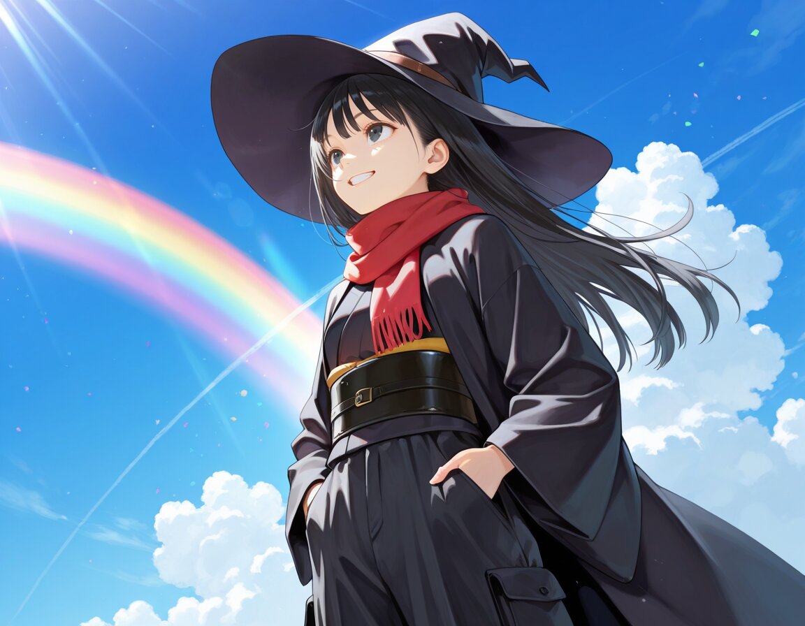 masterpiece,best quality,highres,highly detailed,general,(large rainbow,looking up,looking to rainbow:1.2),1girl,solo,17yo,(hands in pockets, black witch hat,long red scarf,grin),cute girl,slender,small breasts,long sleeves,light smile,black hair,long hair,bangs,black eyes,Witch girl,(long black Witch cloak,long black Witch kimono robe, black obi,long black cargo pants),boots,slender girl,upper body,fantasy, blue sky garden,soft sunlight,from below,