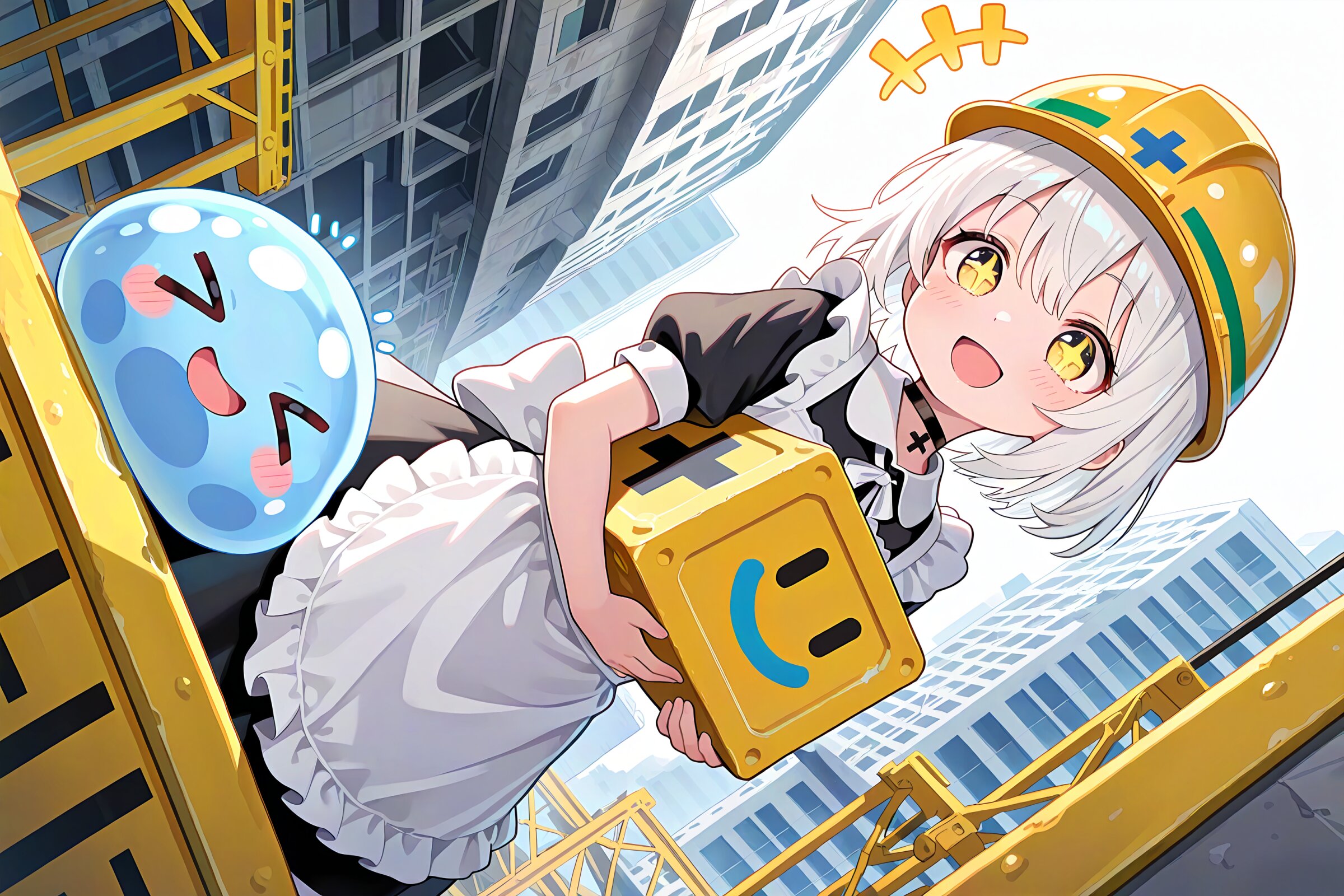 1 little girl, solo, diagonal angle, masterpiece, best quality, amazing quality, very aesthetic, white hair, short hair, yellow eyes, +_+, open mouth, smile, cheerful, +++, notice lines, choker, maid outfit, hard hat, slime, > <, carrying building block, construction worker pose, in construction site,