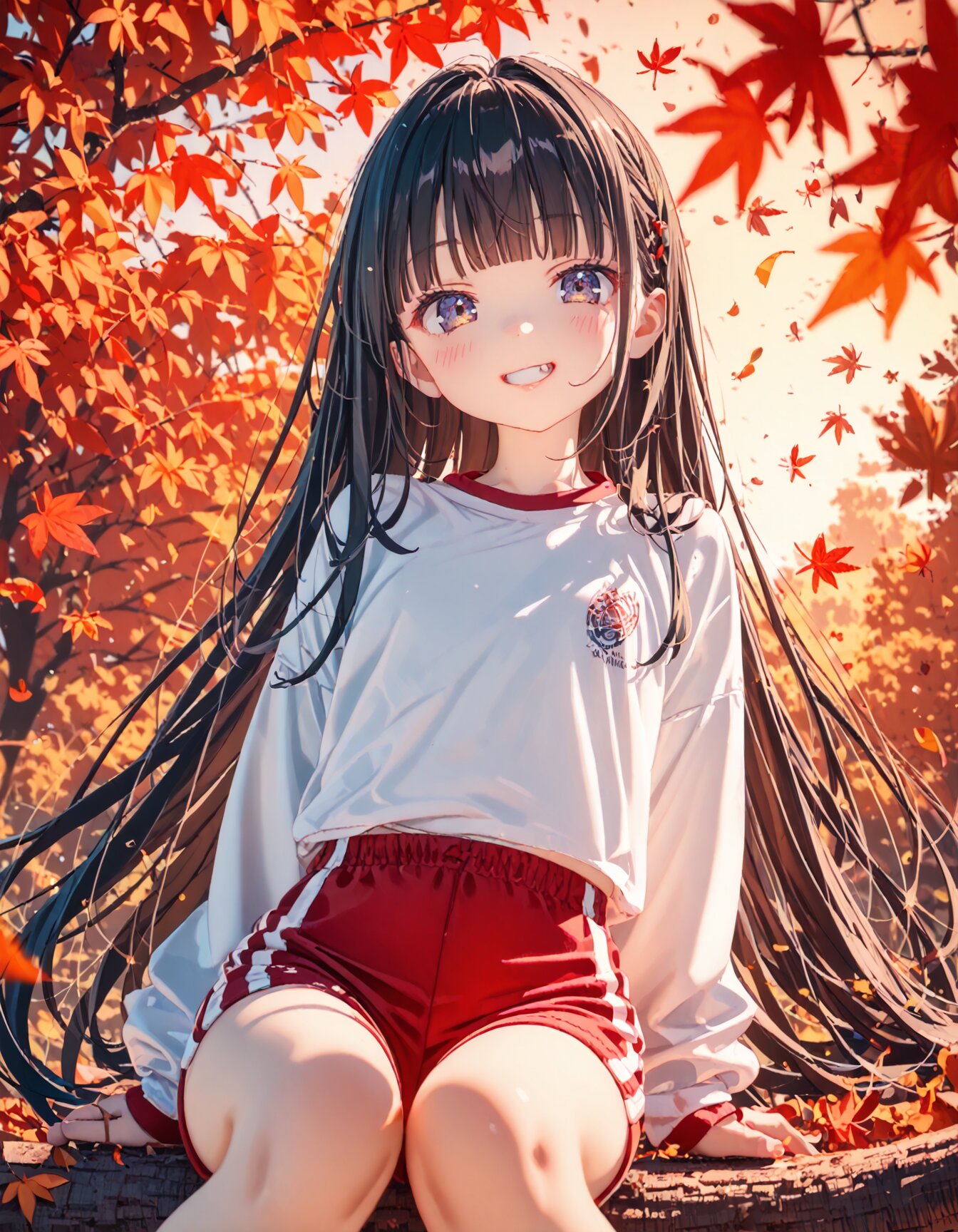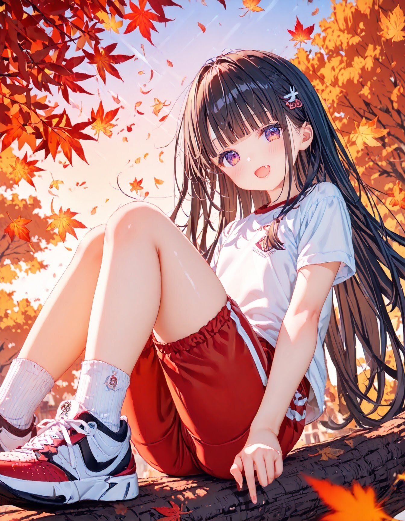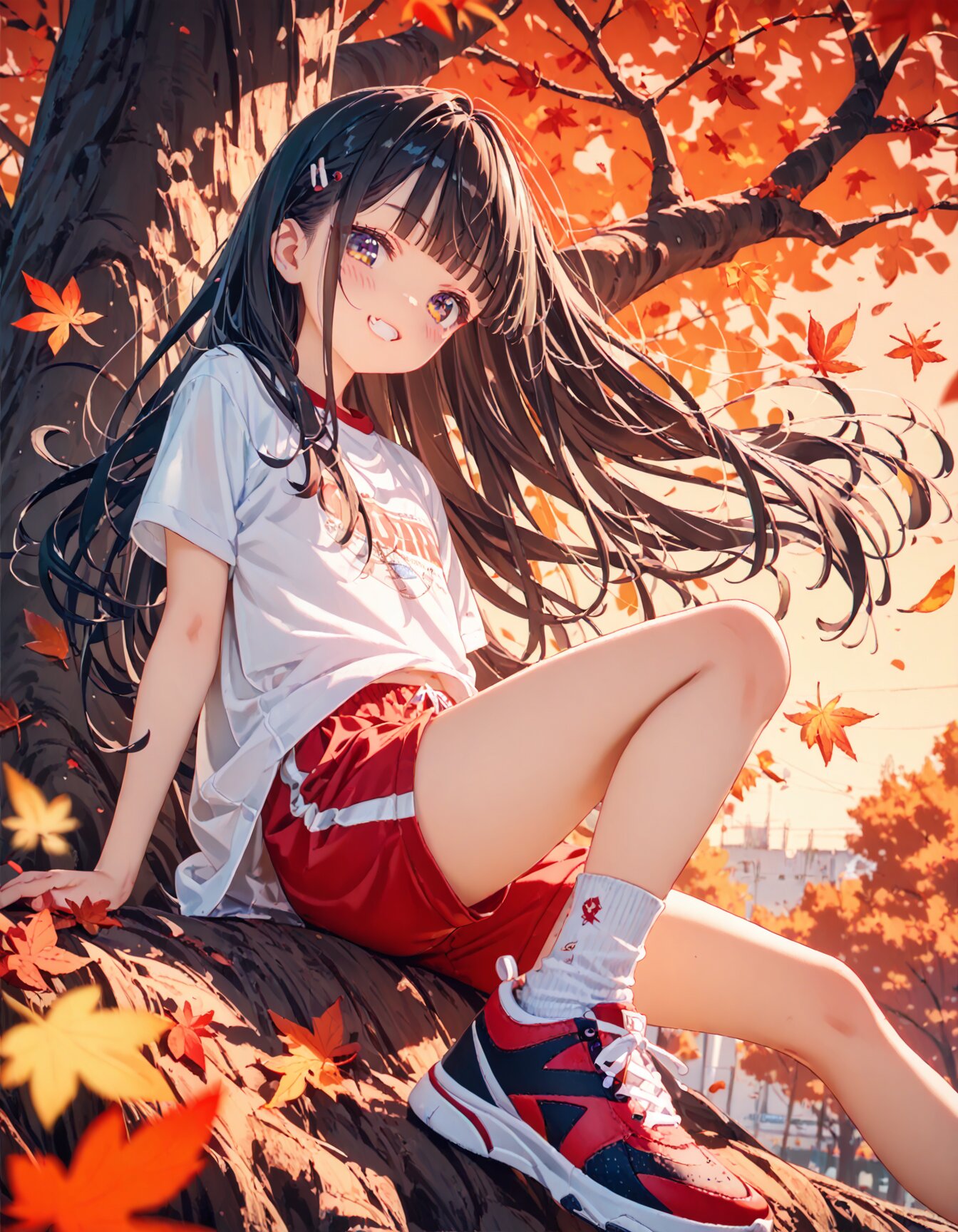score_9, score_8_up, score_7_up, score_6_up, score_5_up, score_4_up, rating_safe, masterpiece, best quality, (high quality, highres:1.0), ultra detailed, (incredibly absurdres:1.0), textuer:1.0, source_anime:1.0, resized, vivid colors, perfect composition, (perfect anatomy:1.3), beautiful detailed skin, extremely detailed clothes, detailed prism eye, cowboy shot, (1 beautiful loli gir)l, detailed face, detailed mouth, Glossy lips, (black hair:1.2), (long hair:1), blunt bangs, small breast, (slender), gym white shirts, gym red bermuda short pants, white socks, sneakers, grin, blush, open mouth showing fang, sitting on the tree, look at viewer, detailed drawings, exquisite depictions, (abstract surrealism:1.3), (outdoor), Autumn scenery, fallen leaves, autumn leaves, orange sky, beautiful lighting, perfect lighting, <lora:Fixhands_anime_bdsqlsz_V1:1>