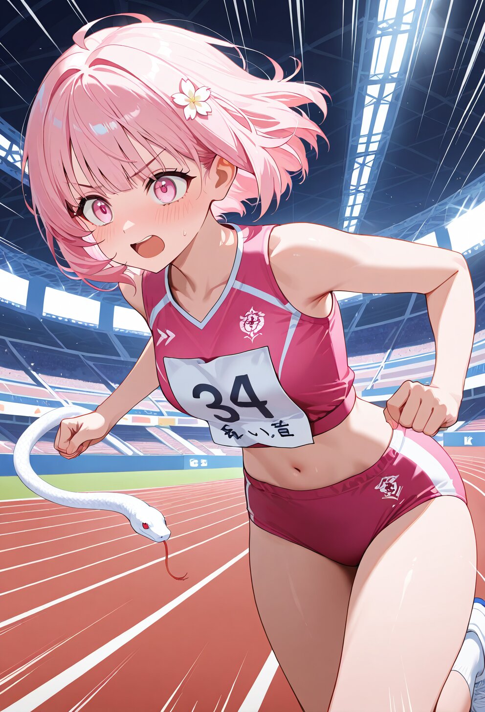 1girl. athlete, light light pink hair,light pink eyes,loose wavy hairstyle,short bob cut,floral hair accessory,track and field athlete,delicate face,detailed face,detailed skin,masterpiece,best quality,insanely detailed,beautiful,16k,track and field uniform,white number bib,pink crop top, light blue high-cut buruma, Open legs.(with a white snake:1.5),arena,sterious atmosphere, with the girl's condescending expression, with the girl's expressive eyes conveying a sense of calm and happiness,The background includes a subtle blur to suggest the girl as the main subject, motion lines, speed lines, emphasis lines, motion blur, chasing, fleeing, wide shot,sunlights,shining lights,lens fraie