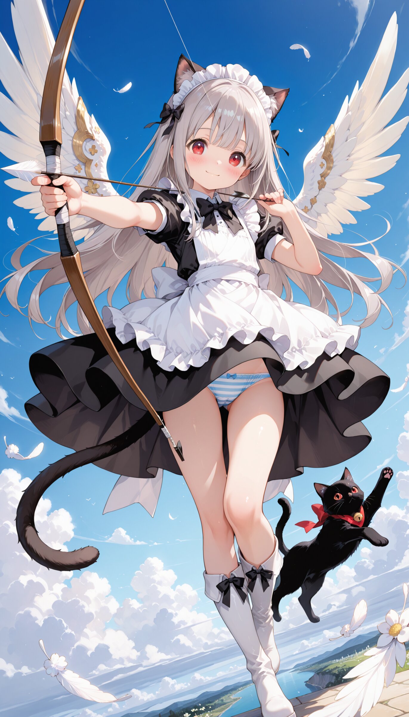 beautiful illustrations, fantastic illustrations with a sense of transparency, masterpiece, absurdres, best quality, highres, ultra detailed, high resolution, (perfect anatomy), (perfect hands), looking at viewer,(1 cute girl:1.3),(12yo),(child),kawaii,platinum hair, long hair,red eyes,((French maid)),black cat girl,(black cat ears),(black cat tail),striped panties,(black and white), heart overflowing, super smile, (blush: 1.3), magical girl's cute white dress like that, flower decoration, cute long boots, flying in the sky ((angel bow)), sky, beautiful clouds, dynamic angle, (drawing bow: 1.5), beautiful detailed background, 4 finger, angel, wings
