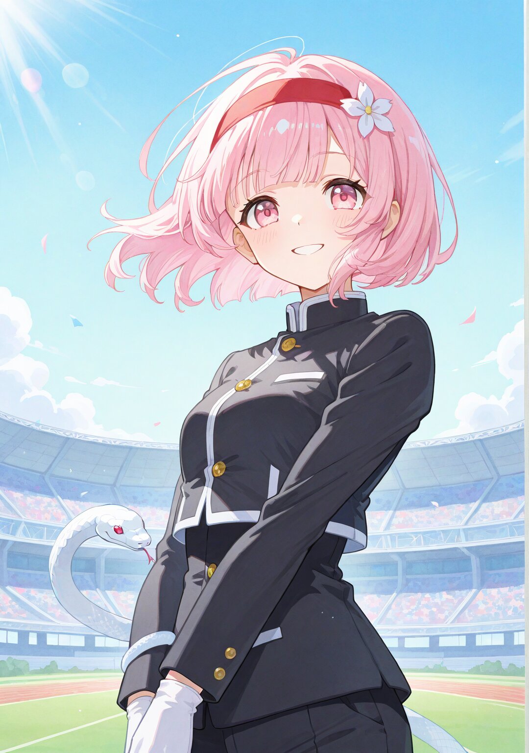 light pink hair,light pink eyes,loose wavy hairstyle,short bob cut,floral hair accessory,happy smile, 1girl, cheering squad leader, black gakuran uniform, red headband, white gloves, dynamic confident pose, standing on school sports field under bright sky, wind blowing her hair and headband, cheering with strong energy and bright smile, crowd blurred in background, morning sunlight, powerful and inspiring atmosphere, anime illustration, highly detailed, masterpiece, vibrant lighting (White Snake:1.2), (soft pastel color palette1.5), (pale colors:1.3), watercolor texture, matte finish, subtle shading, minimal contrast,