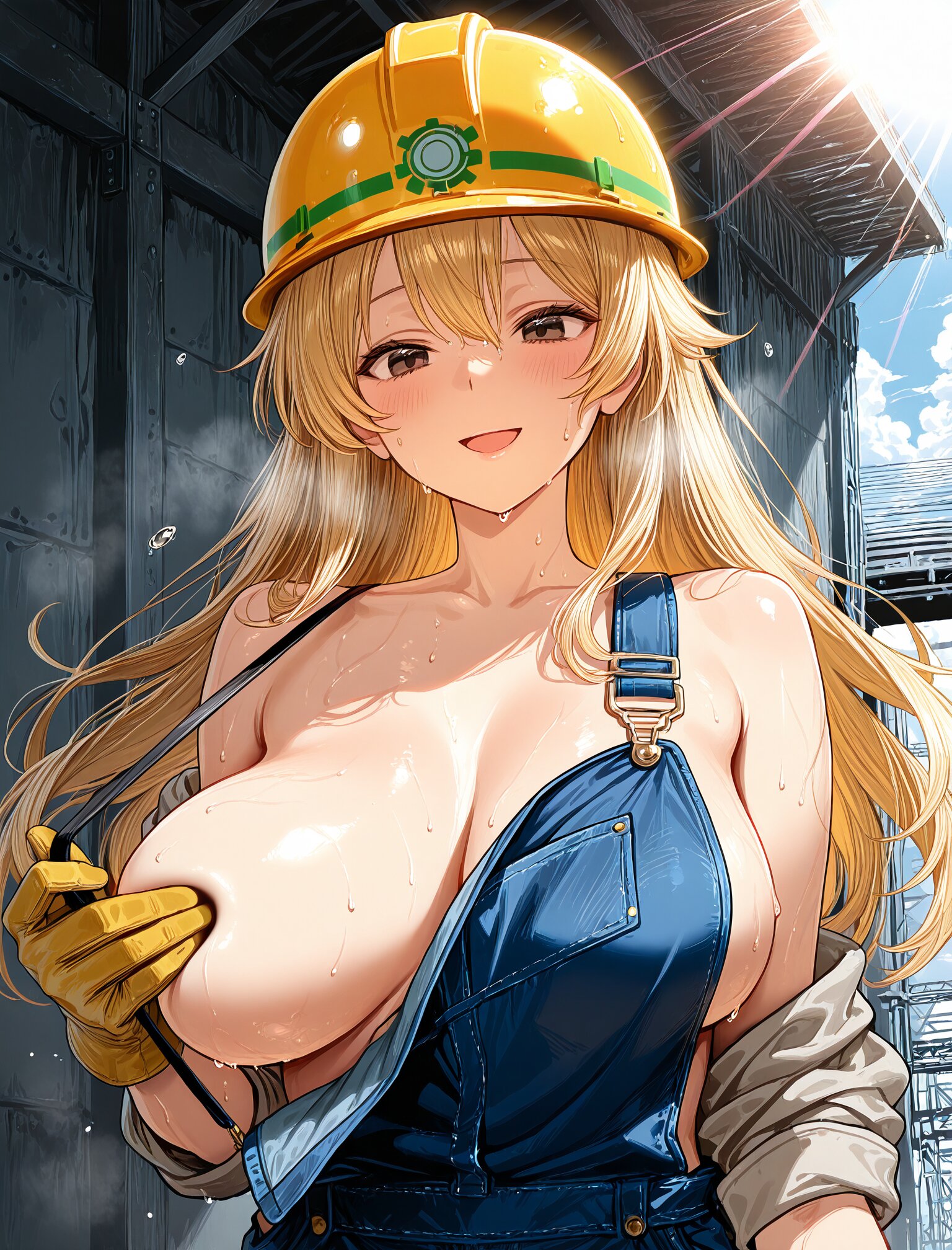 1girl, (upper body shot:1.5), (from chest up:1.5), (portrait:1.5), (perky breast:1.5),(one strap off shoulder:1.6), (slipping strap:1.5), (fallen strap:1.5) (glossy skin:1.3), (soft smile), (long blond hair:1.2), (dark copper eyes), (open mouth),(tank top), (large breasts), (sweat:1.7), (steam:1.5), (beads of sweat:1.4), (sweat droplets:1.8), (sweat running down body:1.2), (glistening sweat) (overalls with one strap down:1.7), (denim overalls), (work gloves:1.5), (overalls only:1.5),(tight outfit:1.5), (wearing a construction helmet:1.4), (hard hat on head:1.3), (construction site background), (sun beam:1.8), (summer sunlight:1.8), masterpiece, best quality, ultra-detailed, 8k resolution, very aesthetic <lora:noobai_ep11_stabilizer_v0.11_fp16:0.7> <lora:StS-Illustrious-Detail-Slider-v1.0:2.> <lora:sdxl-hairdetailer_02:2> <lora:xl_more_art-full_v1:1>