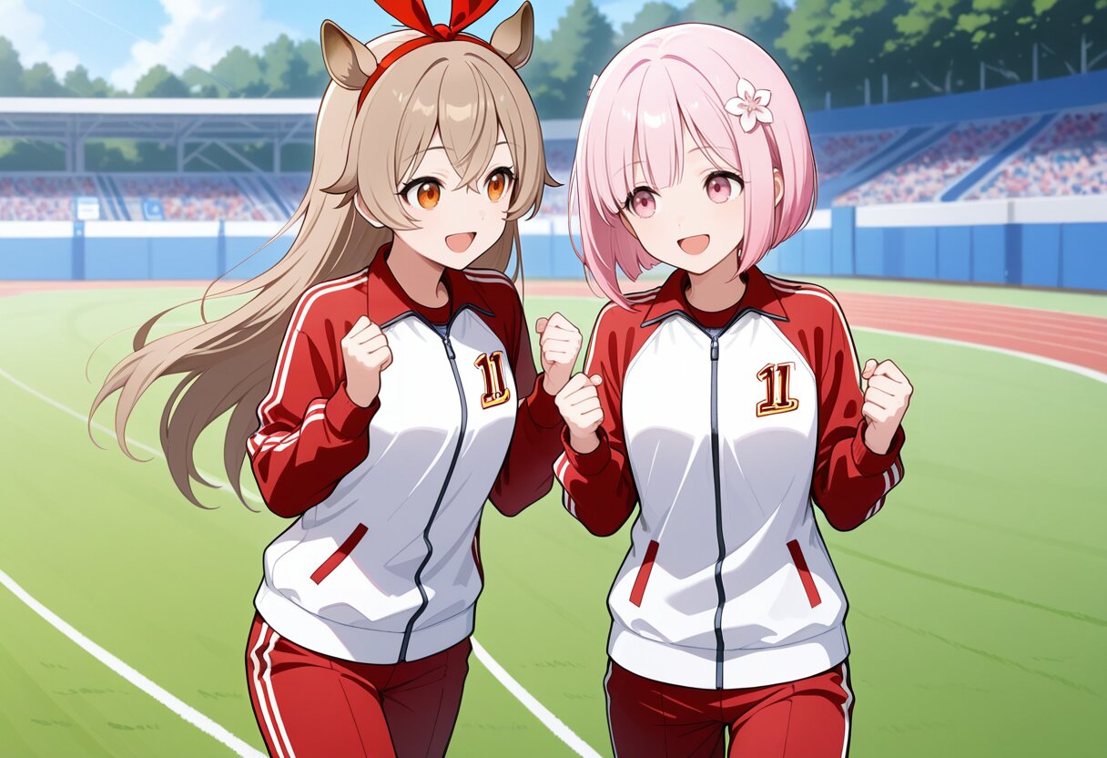2girls,(light brown hair,long hair,amber eyes,wild boar ears,bangs,clenched hands),smile,open mouth,(long sleeves,jersey,Tracksuit,long sports pants,hands up),slender girl,looking at another,walking,sports ground,outdoors,cowboy shot BREAK 2girls,(light pink hair,light pink eyes,loose wavy hairstyle,short bob cut,flower hair accessory,clenched hands,hands up),happy smile,open mouth,(long sleeves,jersey,Tracksuit,long sports pants),slender girl,looking at another,walking,sports ground,outdoors,cowboy shot BREAK masterpiece,best quality,highres,highly detailed,detailed eyes,general,sports ground,outdoors,