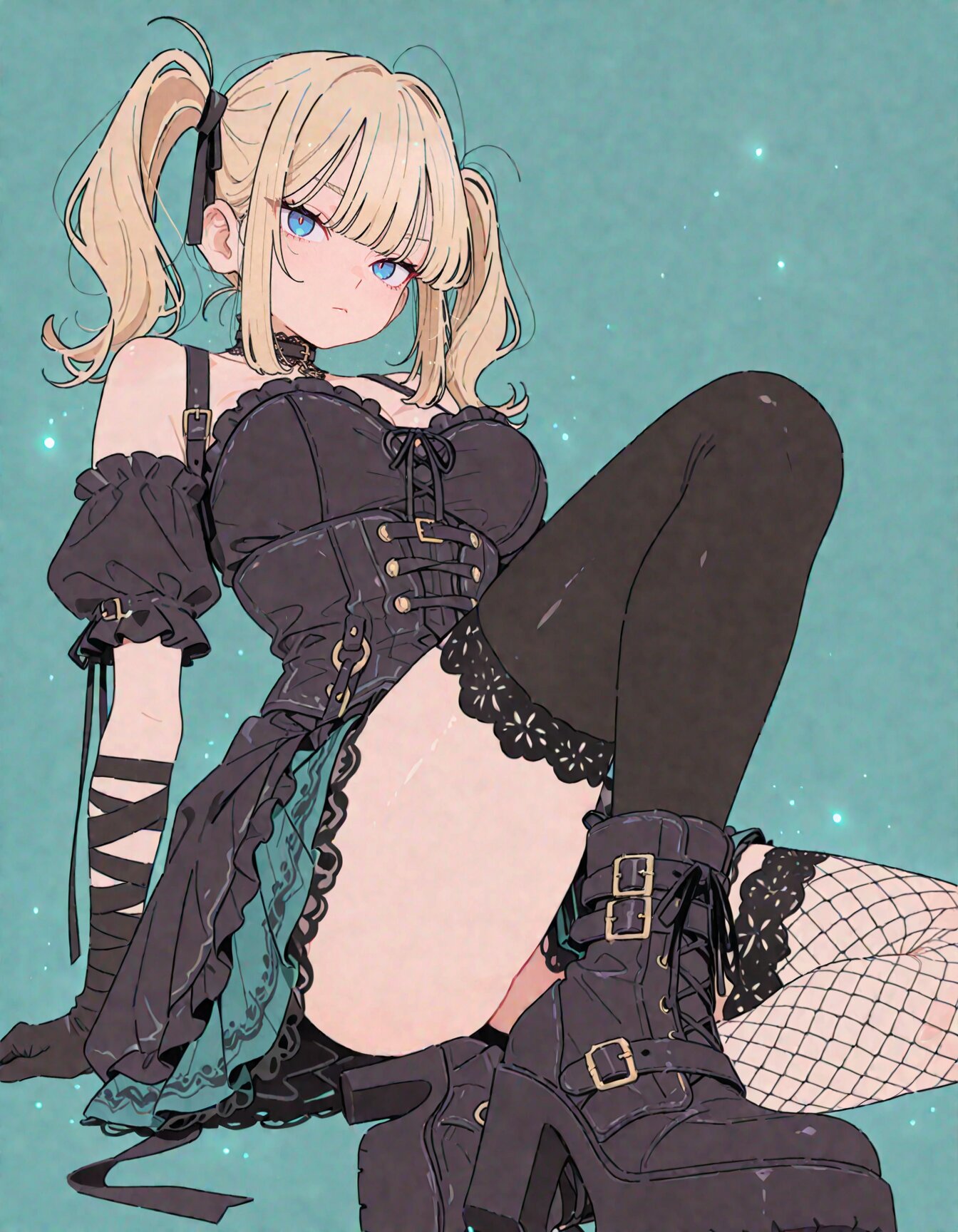 (fisheye,fisheye lens angle:1.0), aerial view, looking afar dynamic angle looking at viewer, 1girl, mature female,, blonde hair, medium hair, messy hair, twin tails, high twin tails, big hair, straight hair, black string hair clip, long bangs, bangs covering eyebrows, long sidelocks, blue eyes, tsurime, sanpaku, gothic lolita, all-black costume, black choker with lace decoration, black lace decoration connected to choker covers neck and shoulders, matte black silk dress, dirndl, off-shoulder, horizontal neckline with black frill decoration, square neckline, strapless, short puff sleeves, voluminous puff silhouette, black leather waist cincher shaped bodice, large breasts, underboobs supported from below waist cincher, black eyelet belt attached to bottom of corset, gold buckle, black flared skirt, wide A-line, lace decoration on skirt hem, black belt around arm, black bandage wrapped around arms, black gloves, bare thighs, asymmetrical thighhighs stockings with ribbon decoration, (fishnet thighhighs:1.0) on one leg, opaque black thighhighs on one leg, black platform boots with heels, bare shoulders, reclining, (simple background:1.0), (turquoise green background:1.0), masterpiece, best quality, amazing quality, very aesthetic, absurdres, newest, professional art lots of details, , overexposure, shiny-glistening, (watercolor style:0.0), (pastel color style:0.0) 4ur4_illu,shiny, glowing, glowing particles, glowing light particles, light particles, turquoise green lightning <lora:noline (1):-0.5> <lora:sdxl2-flat2-512b:0.15> <lora:facelightup_xl_v10:0.5> <lora:V2_yakumo_alchemy:0.5> <lora:Aura_illu:0.1>