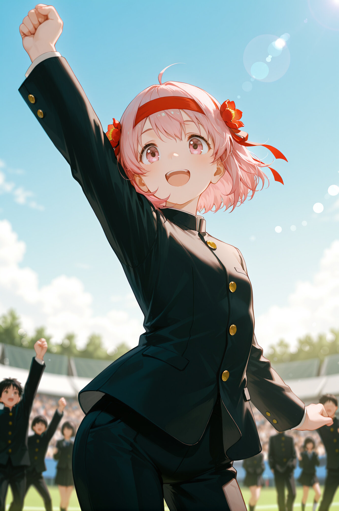 masterpiece, best quality, absurdres, 8k, ultra detailed, aesthetic, very aesthetic, newest, <lora:Fixhands_anime_bdsqlsz_V1:0.5>, <lora:bold-16oa:-0.5>, (realistic:0.3),BREAK (bokeh,shallow depth of field,Gaussian Blur:1.6),(lens flare:1.3),1girl,outdoors,blue sky,(school yard,cheering,dynamic pose:1.2),(crowded,audience, students:1.3),1girl,light pink hair,light pink eyes,loose wavy hairstyle,short bob cut,floral hair accessory,happy,(traditional black gakuran, oversized, gold buttons:1.2),(beautiful brown eyes:1.1),(teen, cute,tareme:1.3),day, outdoors, sports festival, headband,open mouth,(cowboy shot|from below:1.3),(flat chest,curvy :1.1)<lora:USNR STYLE_XL_loha:0.8><lora:relaybaton_Illust_v1:0.65>