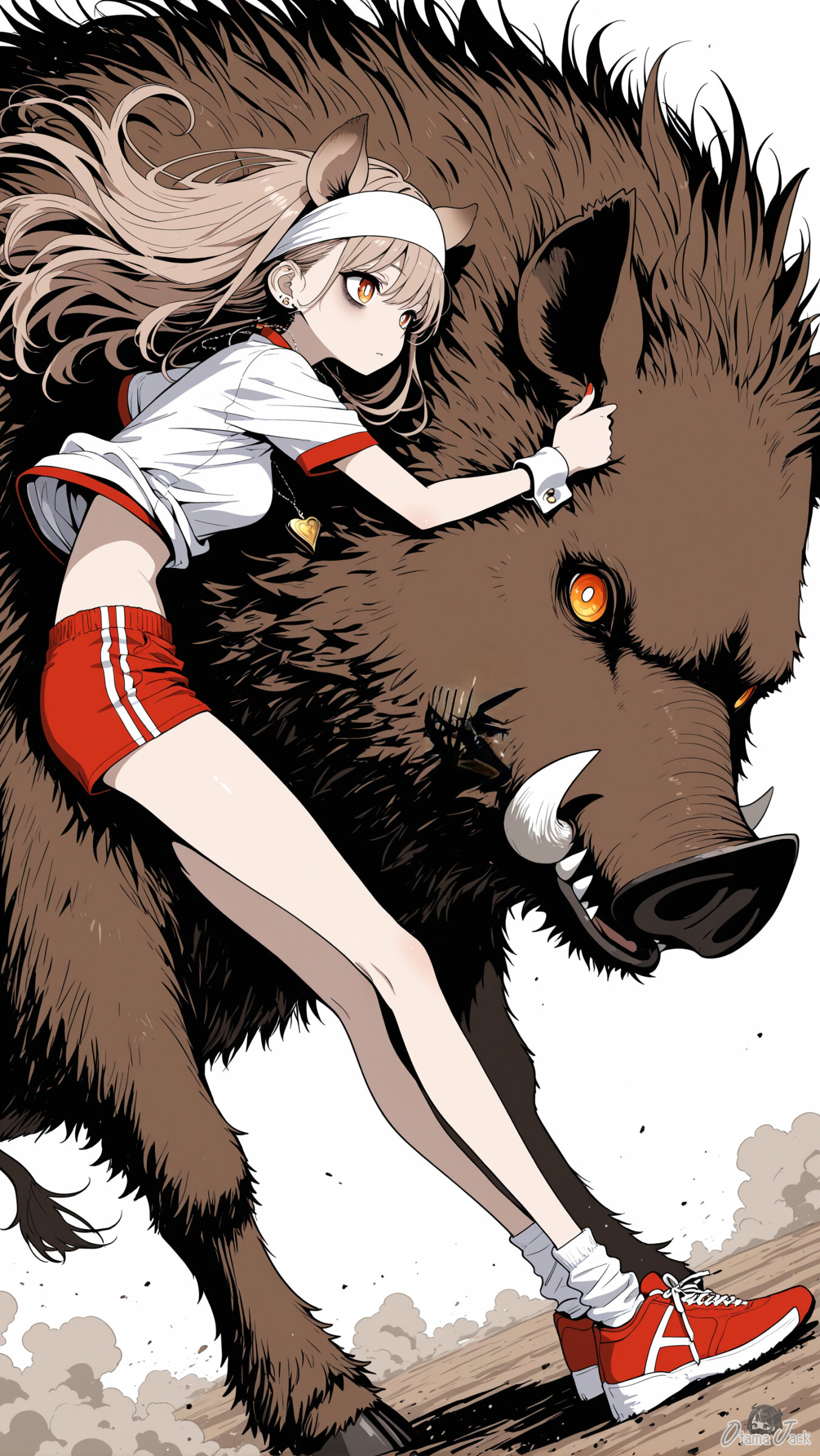 light brown hair, long hair, amber eyes, (wild boar's ears:1.2), gym uniform,school gym clothes,White headband,shorts, Raise hand, reach out, BREAK School grounds, dirt ground, sports day,School, Riding wild boar, wild boar, herd,Giant wild boar,(riding boar,girl on wild boar:1.1), Running boar, dust cloud, speed lines, from side,Dutch angle,