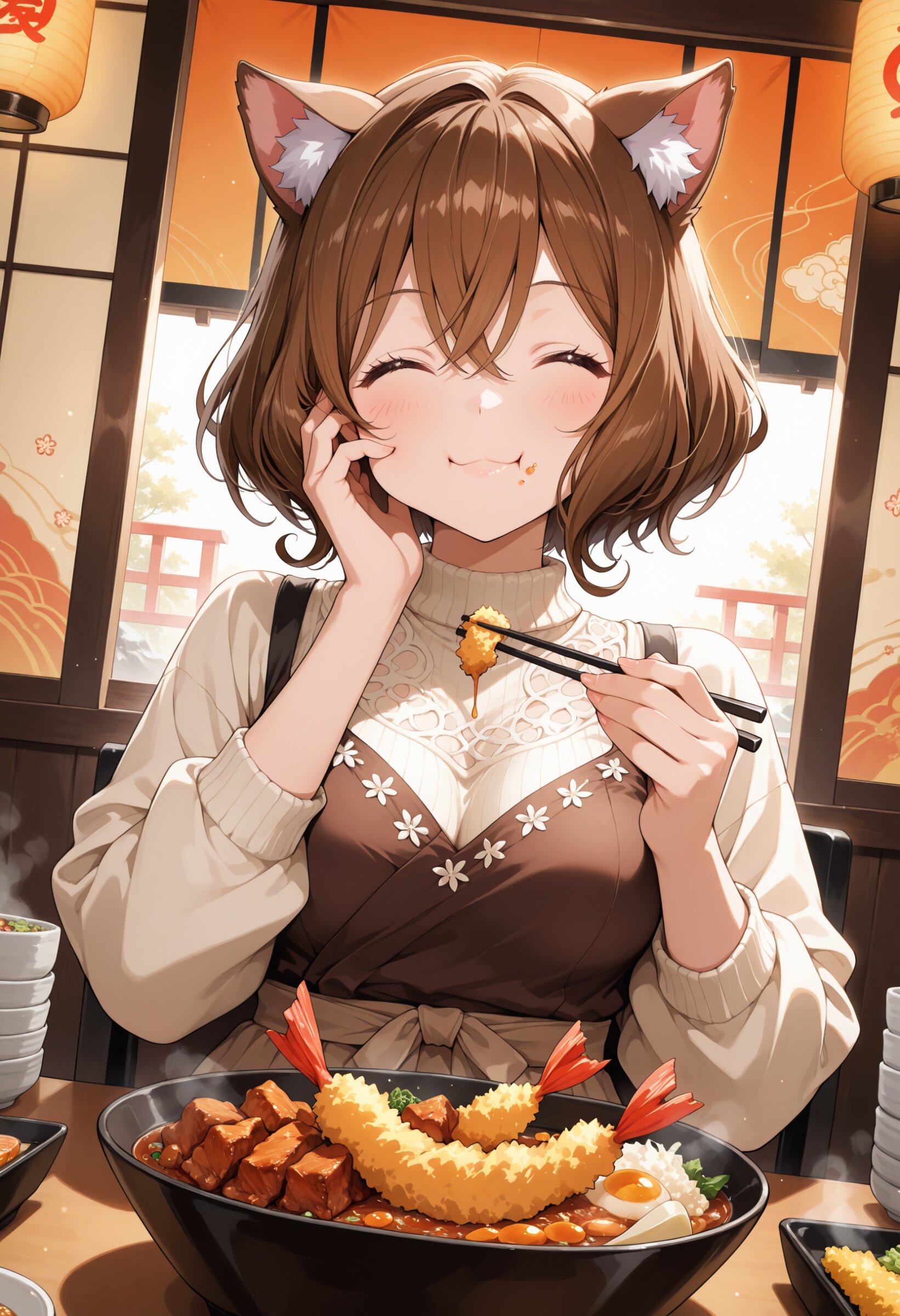 (masterpiece, best quality, ultra-detailed, intricate details, anime style, 8k illustration), 1girl, brown cat ears, brown eyes, chestnut brown hair, wavy bob hair, hair between eyes, loose inward curls, medium breasts, casual outfit, (one hand touching cheek), eating tempura, holding chopsticks, happy expression, closed eyes, warm and cozy atmosphere, delicious food scene, Japanese restaurant background, steam rising from food, soft lighting, appetizing colors, diagonal angle, dutch angle,