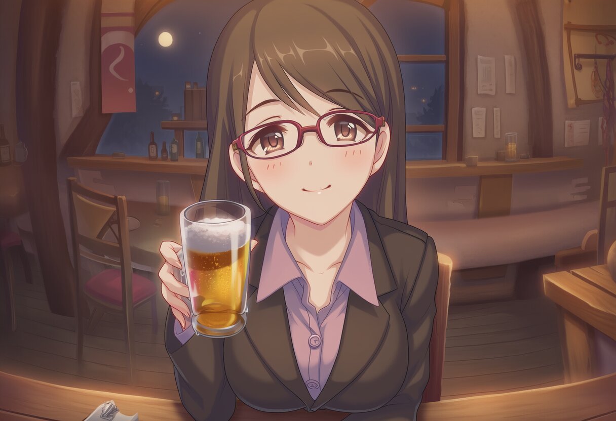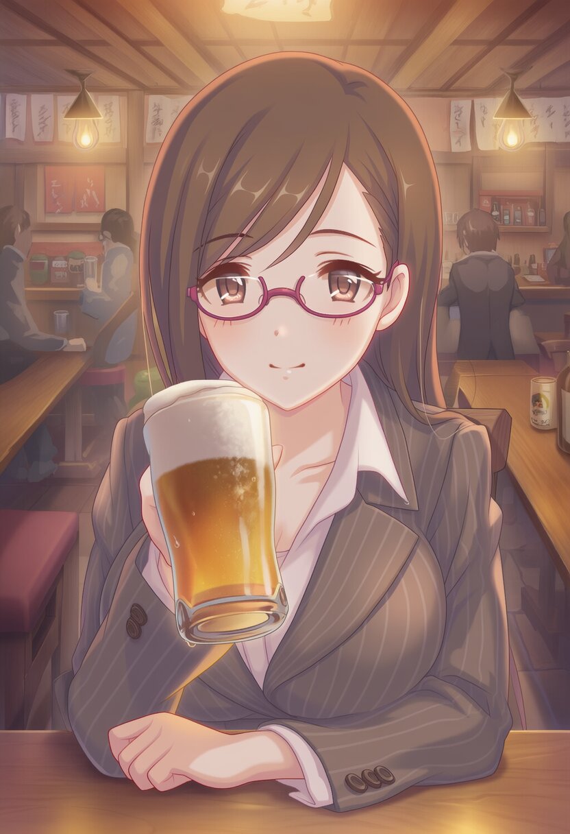 {{{highly detailed}}}, {{official style}}, {{game cg}}, {{intricate}}, {{{detailed beautiful eyes, detailed beautiful face, detailed beautiful face and eyes}}}, 1girl, solo, {{cygames style, princess connect!}}, brown eyes, long hair, straight hair, brown hair, swept bangs, glasses, {{happy, light smile}}, large breasts, collared shirt, {{{{{business suit}}}}}, {{holding a beer jockey}}, {{{japanese style, japanese bar, table}}}, chair, night, sitting, facing the front, looking at viewer, straight-on, close to viewer, solo focus, indoor, {{{masterpiece}}}, {{{best quality}}}, {{{very aesthetic}}}, {{{ultra-detailed}}}, {illustration}, {{{extremely detailed}}}, {{{an extremely delicate and beautiful}}}