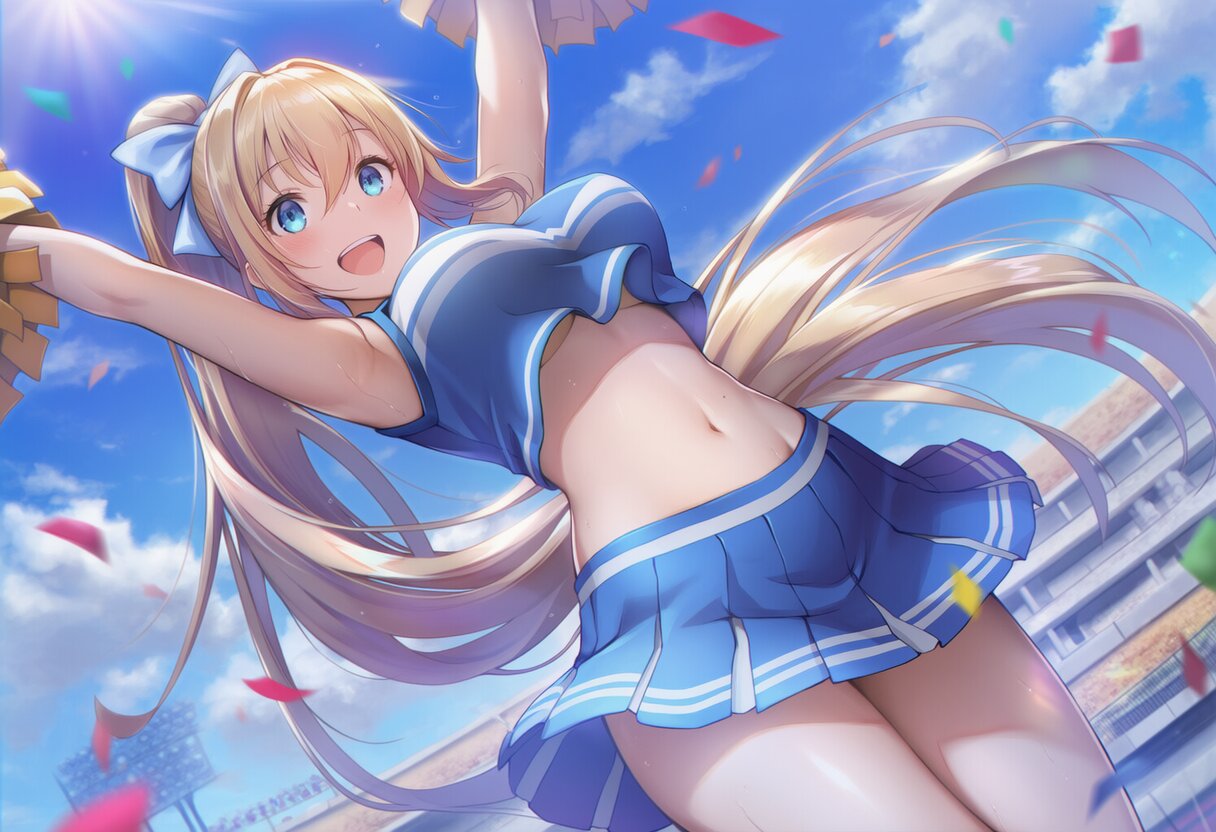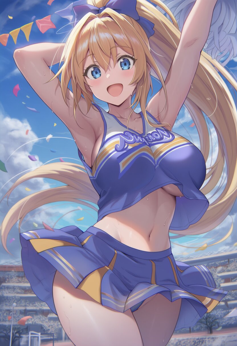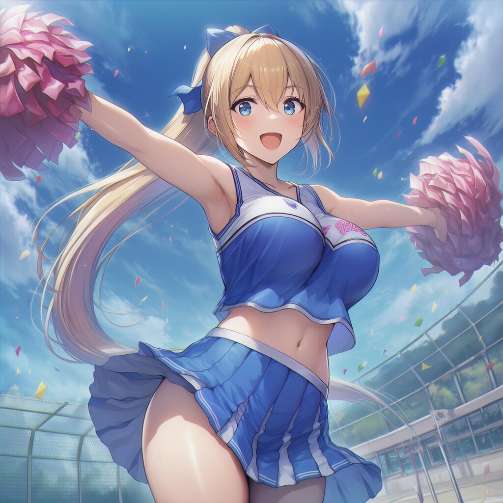{{{highly detailed}}}, {{official style}}, {100-layer}, {{{ultra-high resolution}}}, {{{hi-vision anime}}}, {{intricate}}, {{{detailed beautiful eyes, detailed beautiful face, detailed beautiful face and eyes}}}, 1girl, solo, blue eyes, very long hair, blonde hair, hair between eyes, ponytail, large breasts, open mouth, happy, blush, {{smile}}, navel, wearing blue cheerleader costume, {{{pompon}}}, arms up, cowboy shot, blue sky, {{sports day, school, schoolyard, outdoors}}, {{{masterpiece}}}, {{{best quality}}}, {{{very aesthetic}}}, {{{ultra-detailed}}}, {illustration}, {{{extremely detailed}}}, {{{an extremely delicate and beautiful}}}