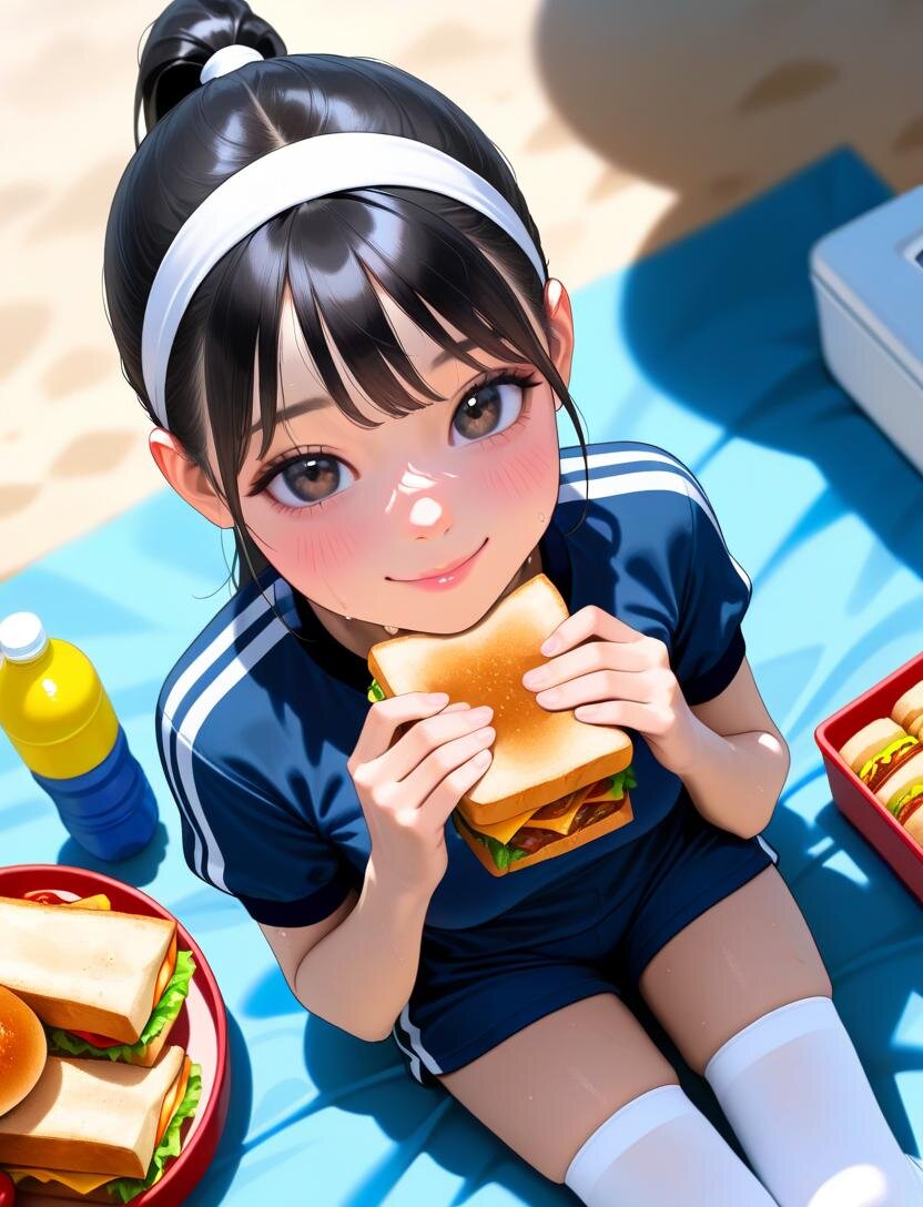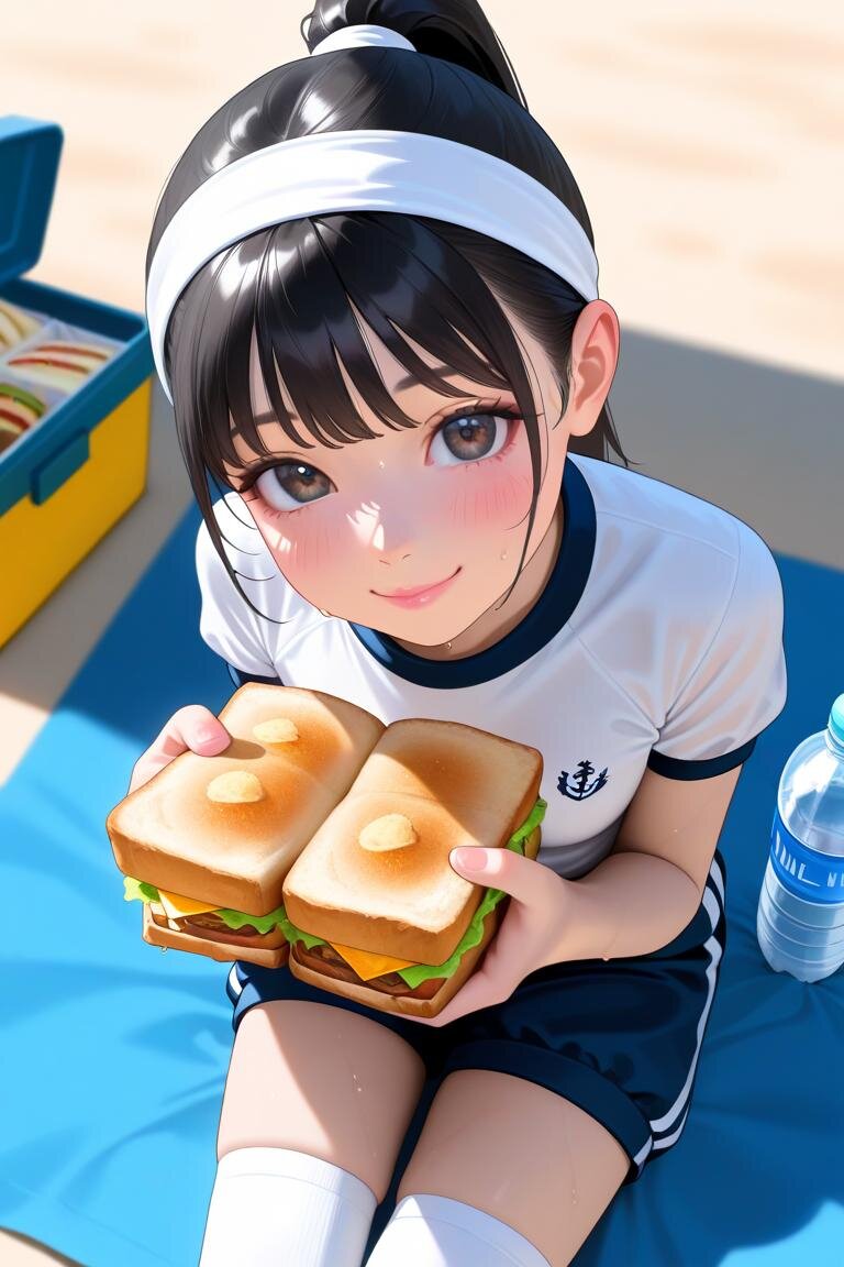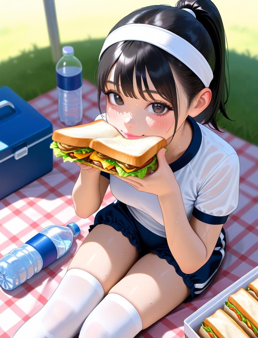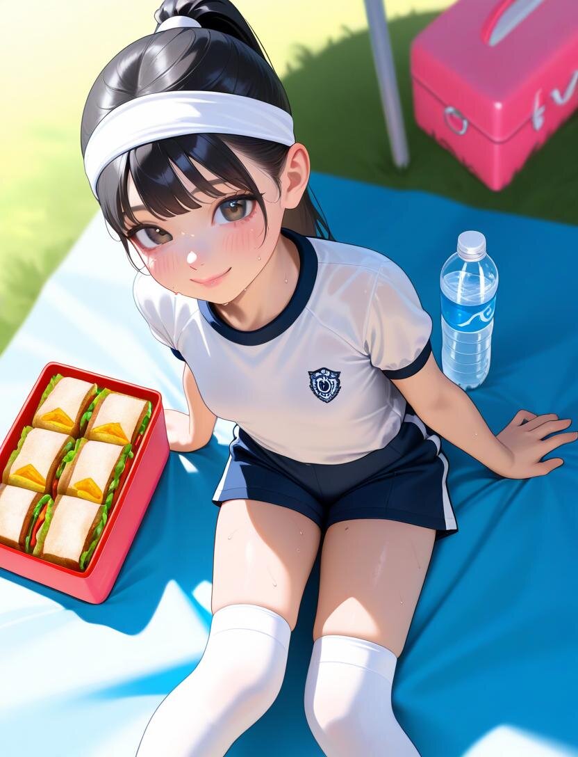 黒髪ポニーテール、中乳、((loli0.7))、zettai_ryouiki、best quality, masterpiece, photorealistic, realistic, ultra high definition, ray tracung、blurry background、cherry pink lip、Gym clothes, navy blue bloomers, short-sleeved shirt, white headband, knee-high socks, natural smile, sandwiches in hands, summer, sweat, slight blush, looking at viewer, angle from above, light blue picnic sheet, lunch box with sandwiches, water bottle,sit on a picnic blanket