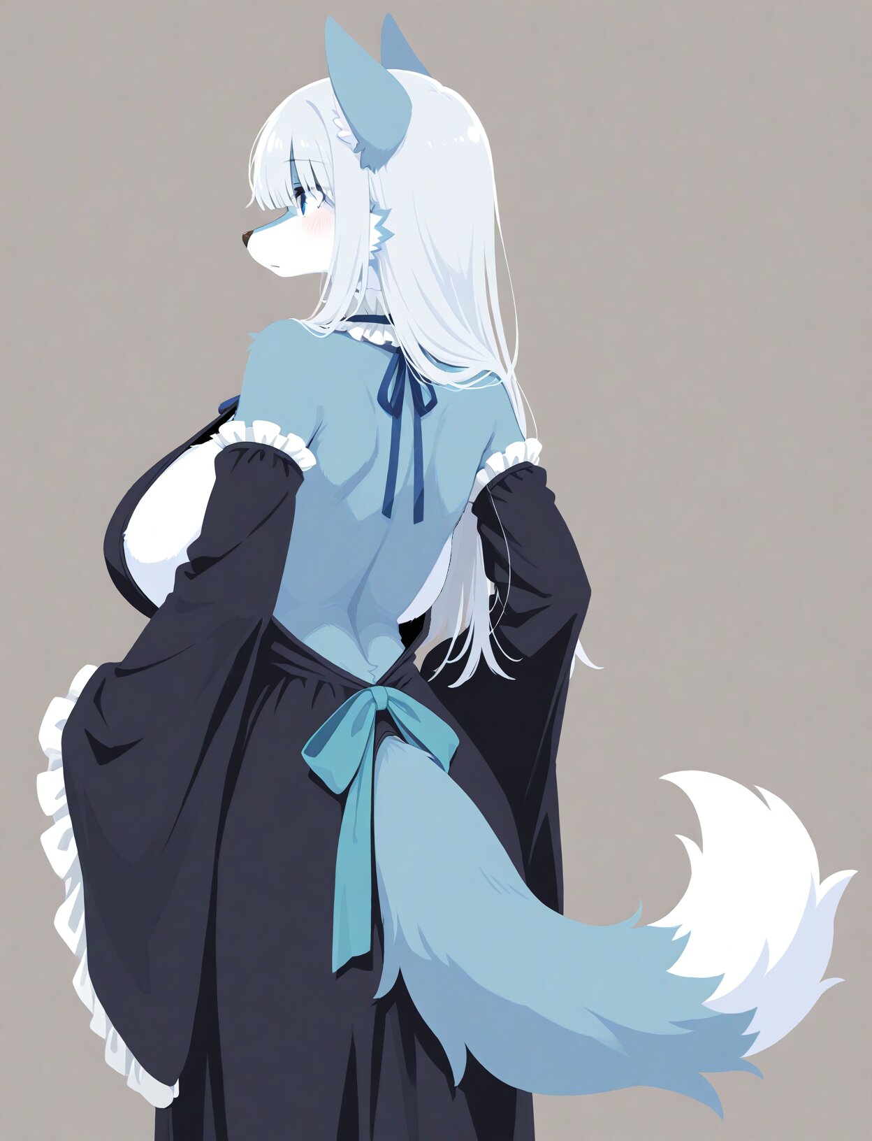 1girl, wolf girl, furry female, snout:1.3, blue fur, wolf ears, ears up, wolf tail, body fur, fluffy fur, gigantic breasts, sagging breasts, slim, silver hair, hime-cut, long hair, hair over eyes, long bangs, high collar, frilled collar, halterneck, blue neck ribbon with loose ends, bare shoulders, revealing clothes, undersized clothes, evening gown, black dress, black sling top, frill-trimmed dress, sleeveless dress, sideboobs, high-waist sideboobs, backboob, clothing cutout, backless dress, large waist bow, detached sleeves, frilled sleeves, wide sleeves, hands on own hips, back focus, gray background, simple background, close-up, looking ahead, from behind, hair shade, low contrast, digital art:1.1, kawaii, softy, 2D, cute, furry, two tone fur, furry body, perfect body, high quality, cute clothes, animal tail, animal ears, solo, masterpiece, correct_anatomy, gddw, pretty and cute, comical, simple, anime, flat color, no lineart, Bright colors, Contour line, pale painting